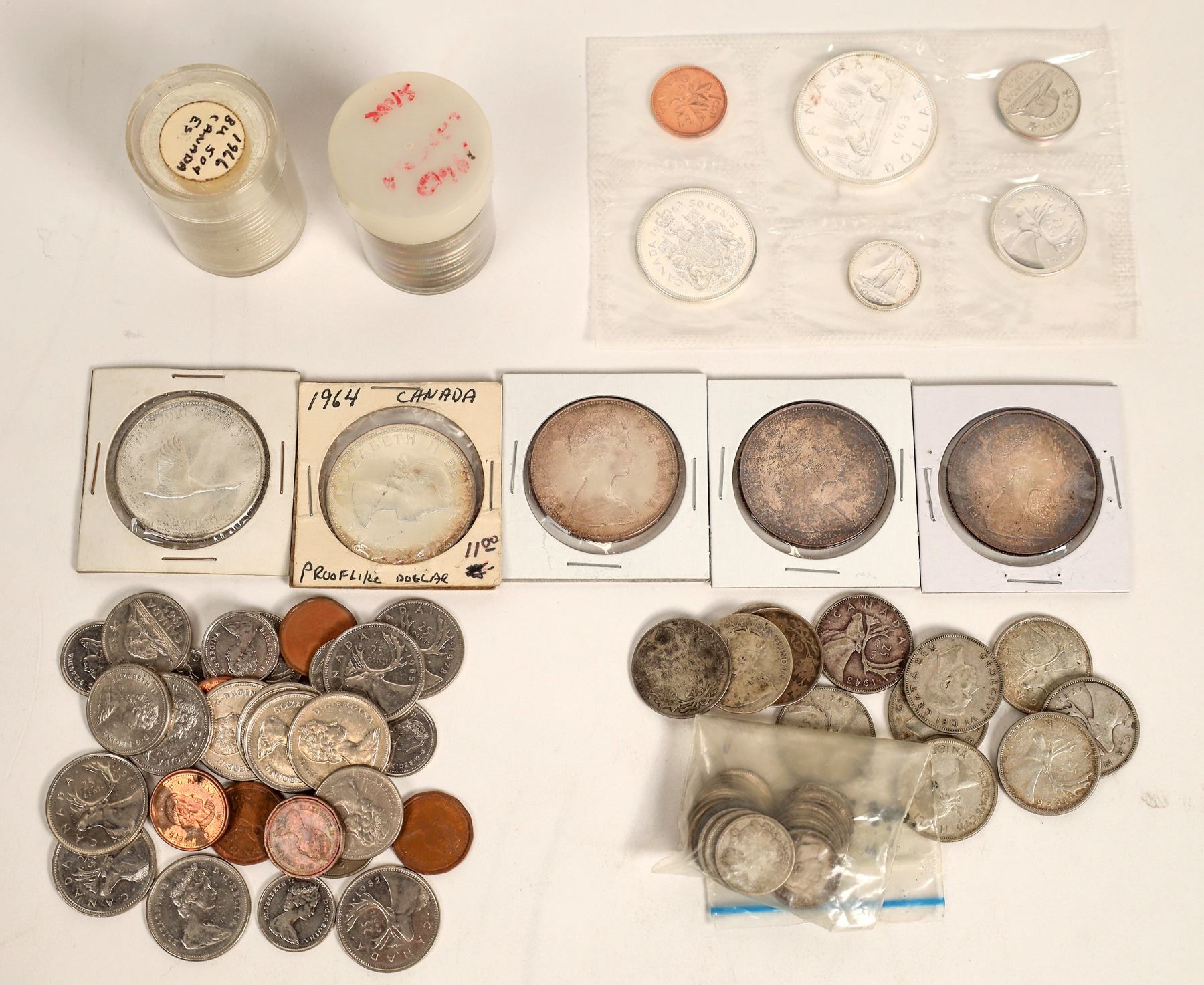 Diverse lot of Canadian coins: 1963 Proof Like Set (carbon spots on the dollar); five $1 coins: 1964, 1965 (2), 1967 (2); all AU-BU condition; miscellaneous coins (about 20) no silver; miscellaneous silver coins: BU roll 1966 fifty cent pieces; 17 circulated silver fifty cent pieces; 21 silver dimes; 12 silver quarters.