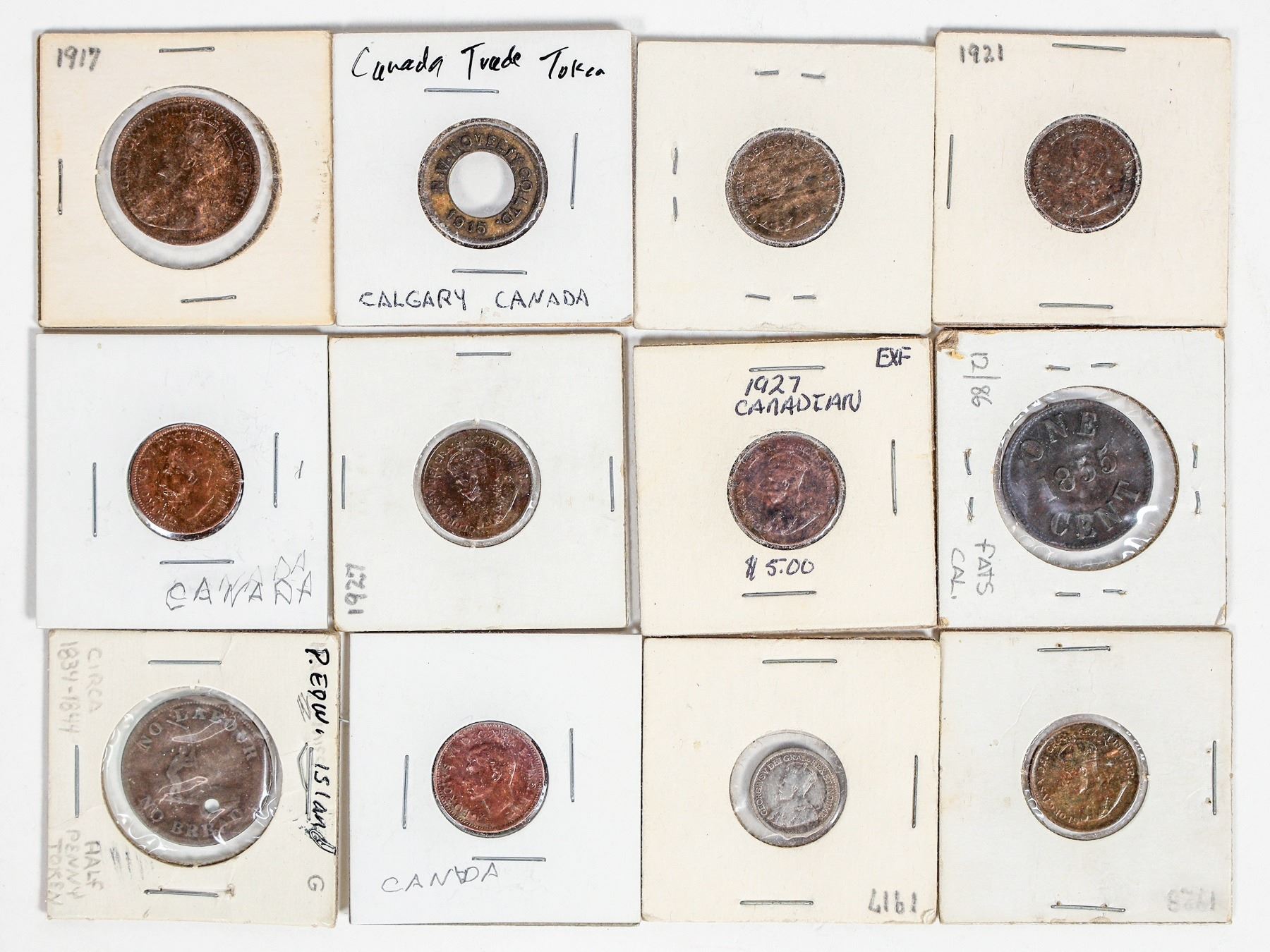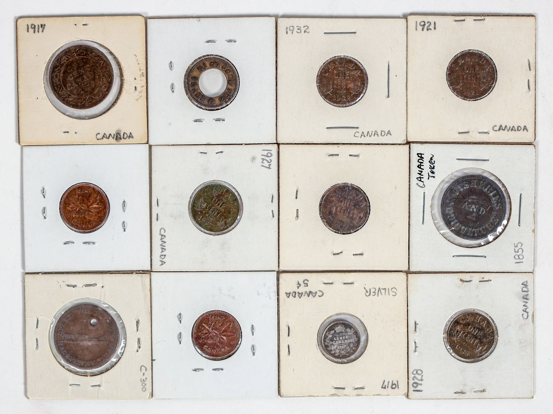 Twelve Canadian coins: 1) 1855 Fisheries and Agriculture one cent; 2) 1945 one cent; 3) 1928 one cent; 4) 1915 N. W. Novelty Co. token, Calgary; 5) 1917 silver five cent; 6) 1932 one cent; 7) 1917 one cent; 8) 1927 one cent; 9) 1921 one cent; 10) 1940 one cent; 11) 1927 one cent; 12) Speed the Plow half penny, Prince Edward Island, holed. Most EF+ condition.