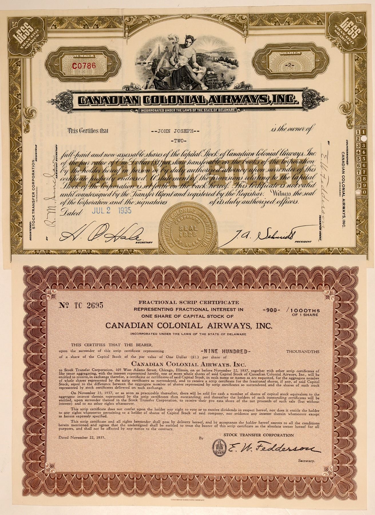 Lot of 2 different. 1) No. C0786, issued for two shares to John Joseph in 1935. Printed signatures of president JA Schmidt and secretary HO Hale. Not cancelled. Green border and seal, black print, allegorical vignette with aviation imagery. Printed by Columbian Bank Note Co. Folds. 2) Fractional Scrip Certificate No. TC 2695, issued for 900/1000ths of a share in 1935. Printed signature of secretary E.W. Fedderson. Not cancelled. Brown border and background, black print. Folds. Founded in 1929 in Montreal, Quebec, Canada. In 1942, it reformed as Colonial Airlines, which was later absorbed by Eastern Air Lines. Served cities in New York, New Jersey, Ontario, and Quebec. Ken Prag Collection
