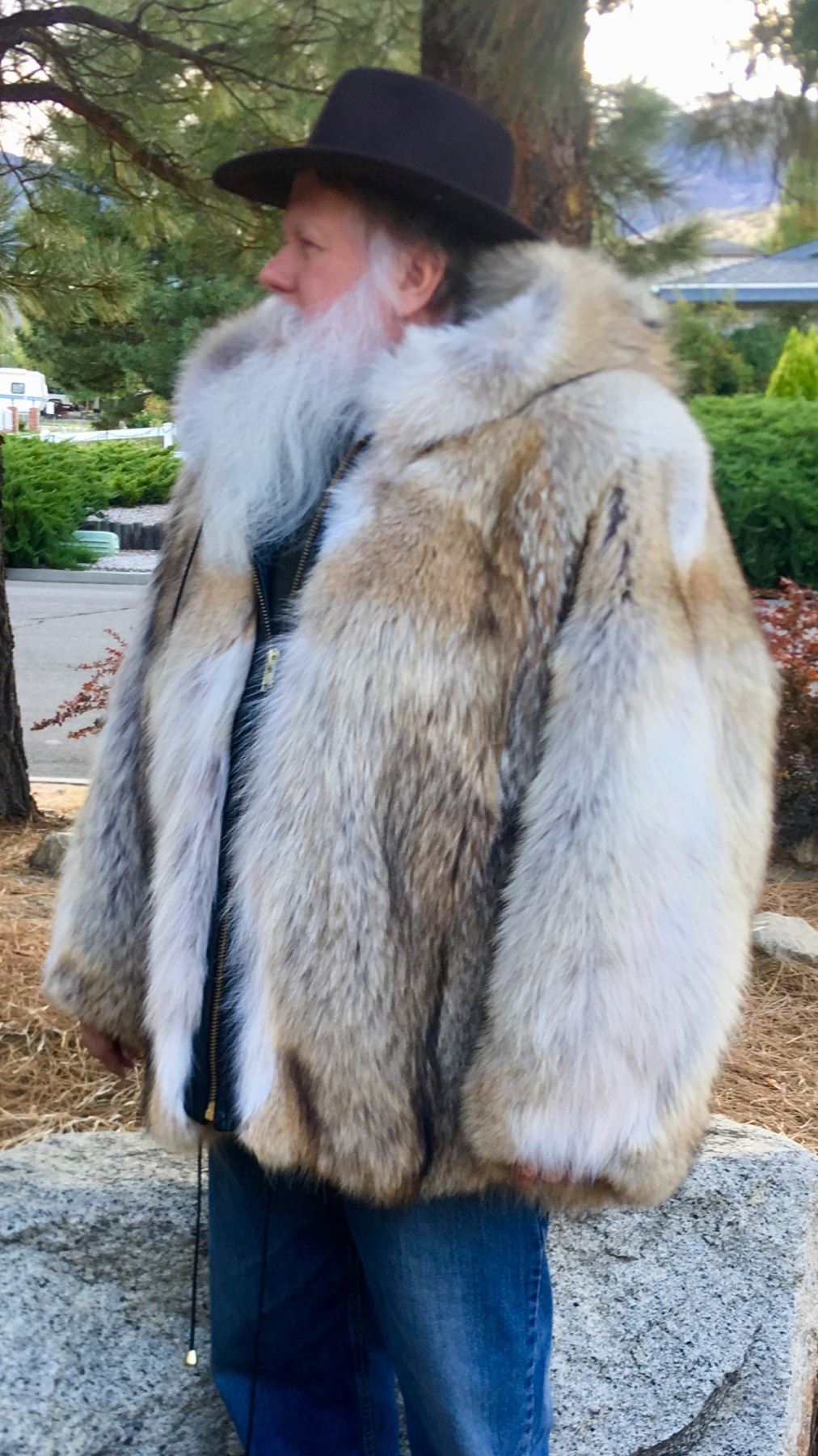Gorgeous, Canadian coyote fur coat, size XL, created by Homme Furs in Montreal, Canada. Fully lined in a black, patterned nylon fabric, with a full-length YKK brass zipper, two, black velveteen-lined pouch pockets on the outside front, one similarly lined pouch pocket on the inside left, and a generous, black velveteen-lined hood with nylon-corded drawstring closure. Base of the coat also has a drawstring cinch. Length is thirty inches from collar seam, easily falling at or below the waist for even a tall person. Built for extreme cold weather, this very elegant coat can be comfortably worn by a man or woman.