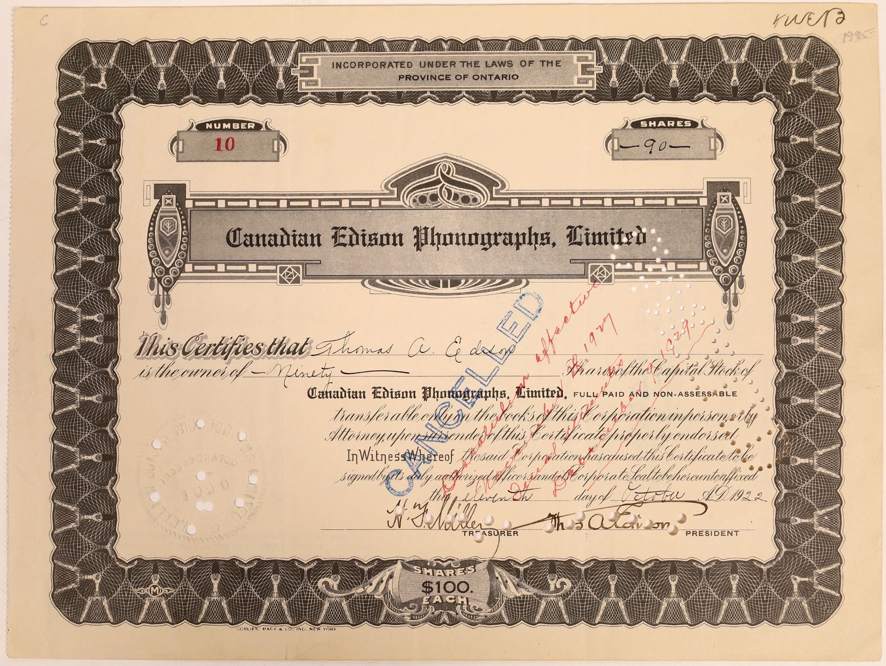 Inc. under the laws of the Province of Ontario. Low number 10, issued to Thomas A. Edison for 90 shares on Oct. 11th, 1922. Signed by Thomas Edison as president and Harry Miller as treasurer. Signatures are punch cancelled. Stock is also punch, pen, and stamp cancelled. 8.5 x 11" Folds. This company took over the assets of St. Thomas Cabinets, Limited, in 1920. Thomas Edison (1847-1931) is often thought of as "America's greatest inventor." He developed many devices related to electric power generation, mass communication, sound recording, and motion pictures, including the phonograph, the motion picture camera, and early versions of the electric light bulb.