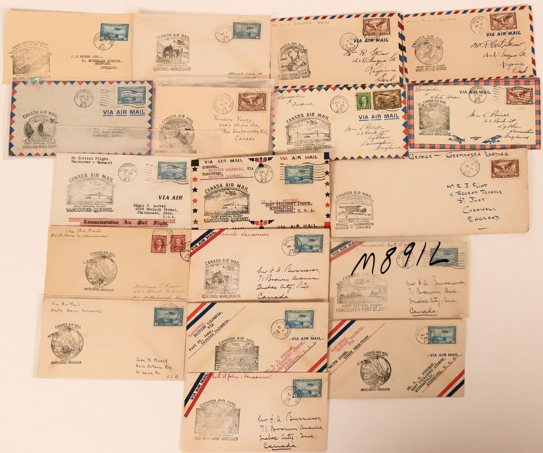 Lot of 17 First Flight Covers, most August 1938. Routes include: Vancouver to White Horse, Yukon; Vancouver to Quesnel, British Columbia; Ware, B.C. to Prince George, B.C.; Fort Saint John, B.C. to Vancouver; Germansen Landing to Prince George; and Williams Lake to Vancouver. Please inspect. Date: 1938 Country (if not USA): Canada State: City: Provenance: John Reynolds Collection