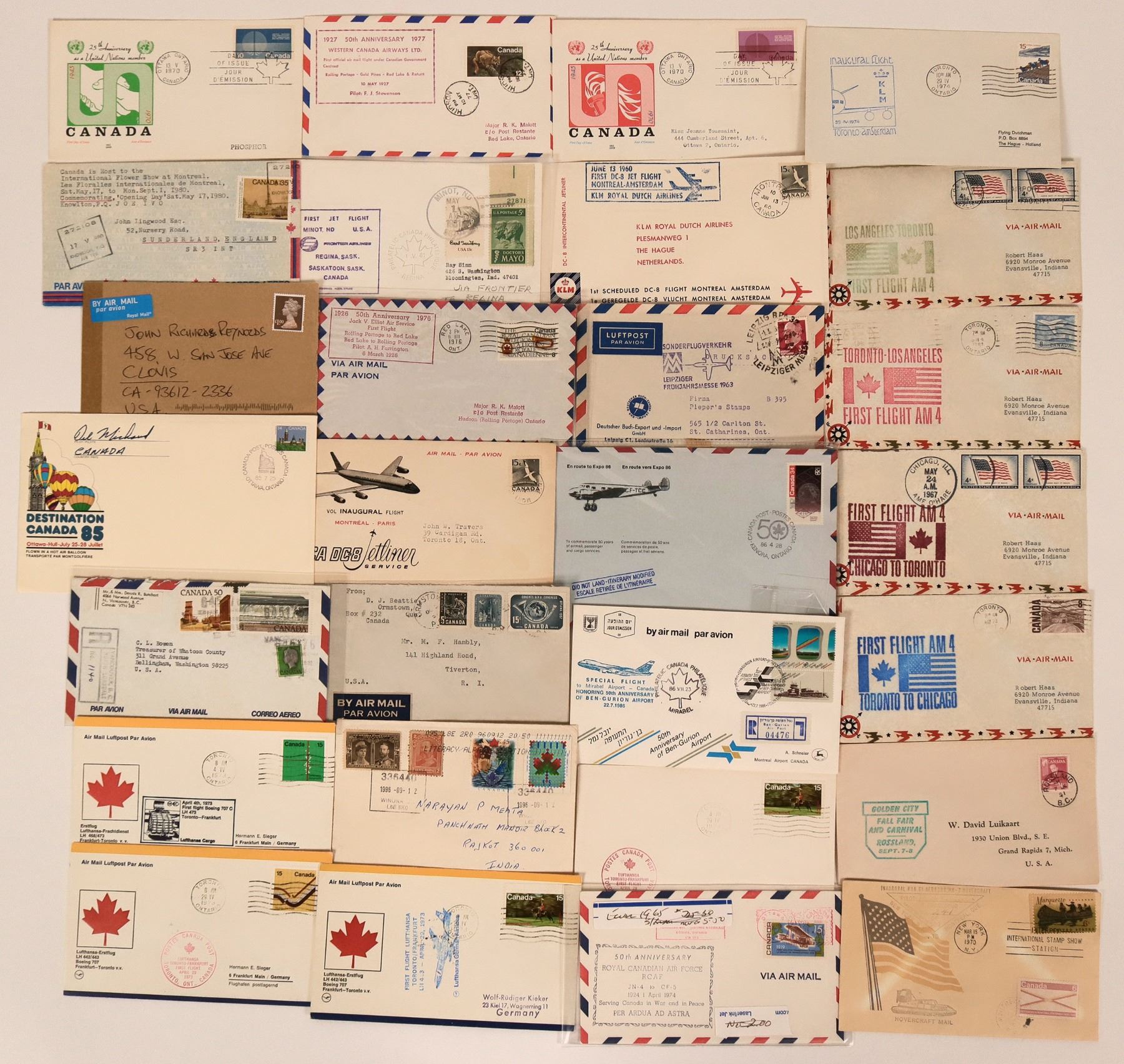 Lot of 28 1960 up First Flight Covers. KLM Royal Dutch Airlines, legally Koninklijke Luchtvaart Matschappij N.V. is the flag carrier. In March 1960, the airline introduced the first Douglas DC-8 jet into its fleet. First Boeing flight Boeing 707 C LH 473 Toronto-Frankfurt Germany. KLM Inaugural flight Toronto-Amsterdam traveling from Montreal Amsterdam to make mail deliveries. Frontier Airlines traveling from Lufthansa Toronto-Frankfurt, Sask, Saskatoon, Sask Canada .