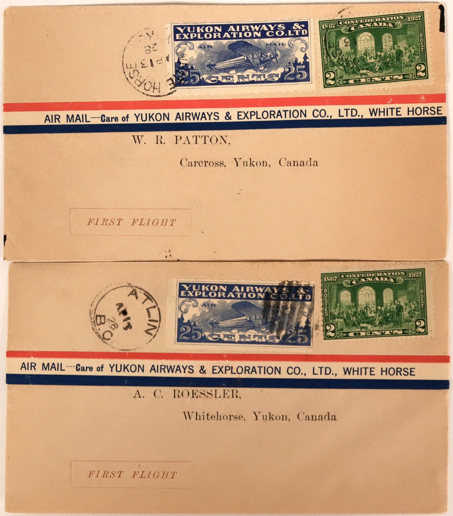 Two 1st flight covers by Yukon Airways & Exploration Co., LTD., White Horse Canada, April 1928. Each with 25 cent and 2 cent stamps.