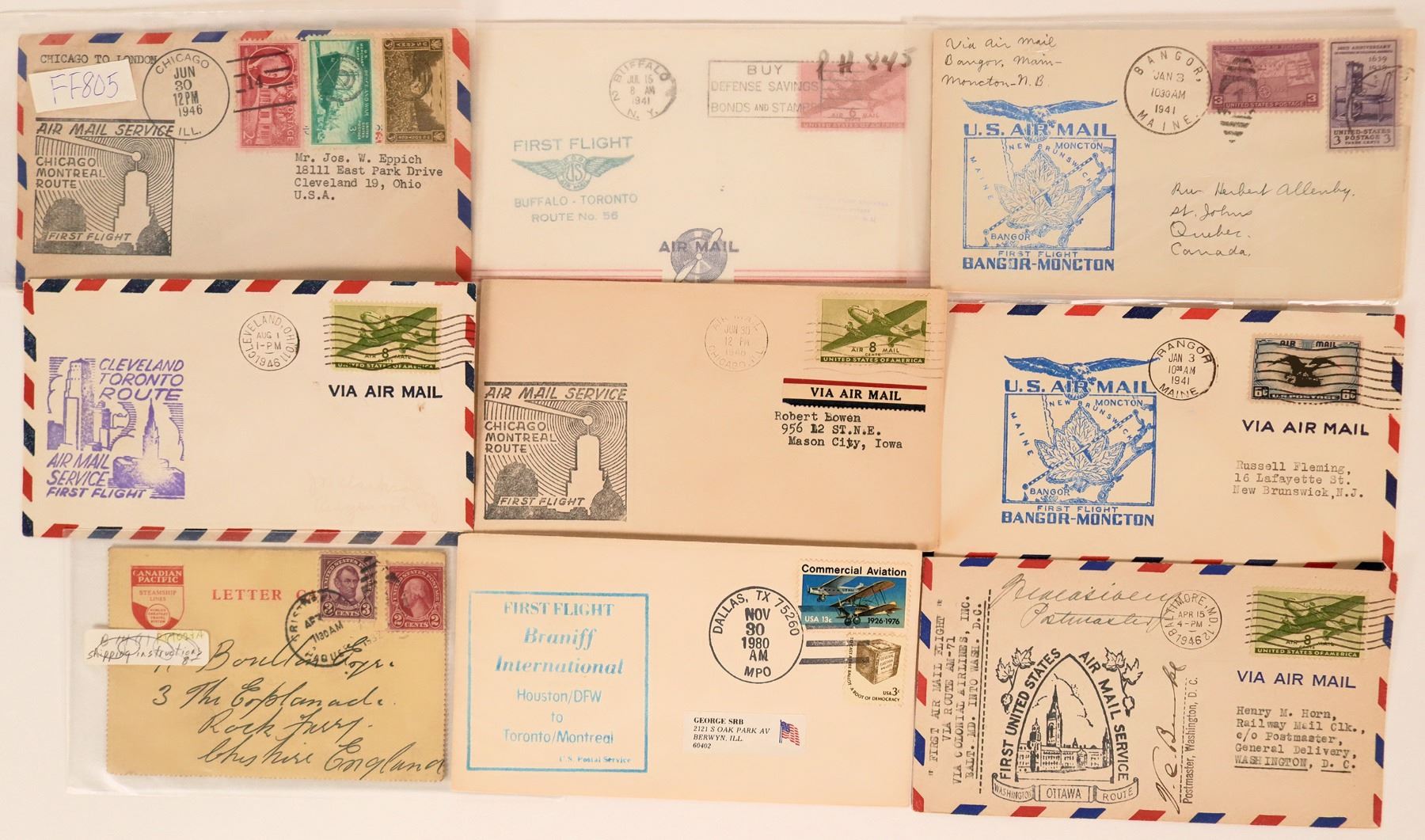 Lot of nine First Flight covers, 1941-1980. Majority in the 1940s. Includes: Colonial Airlines, Inc., Baltimore, MD to Washington D.C., Houston to Toronto, Bangor Main, Chicago and Buffalo. Please see photo.