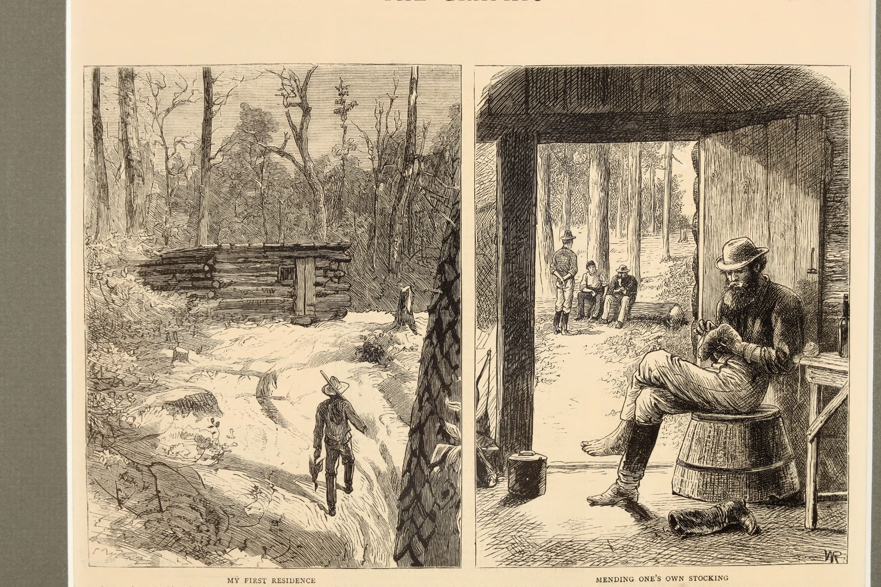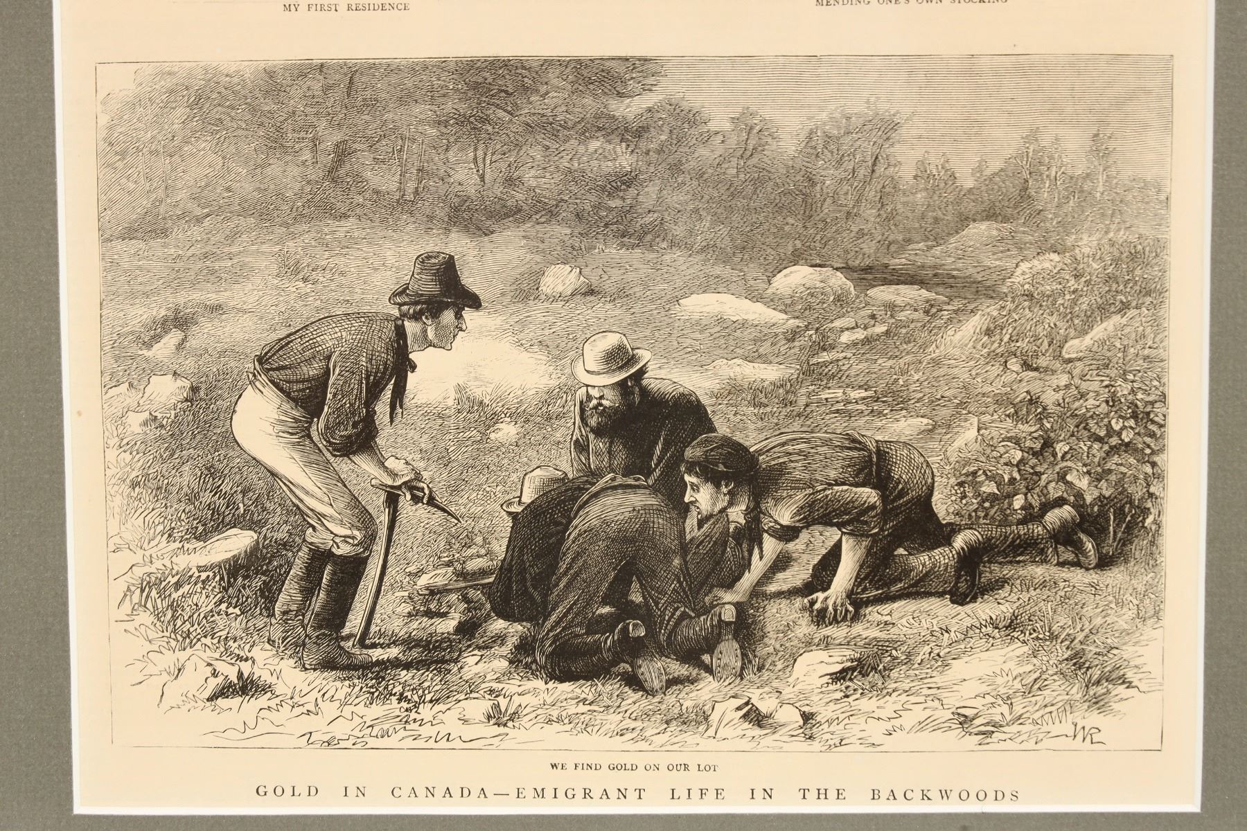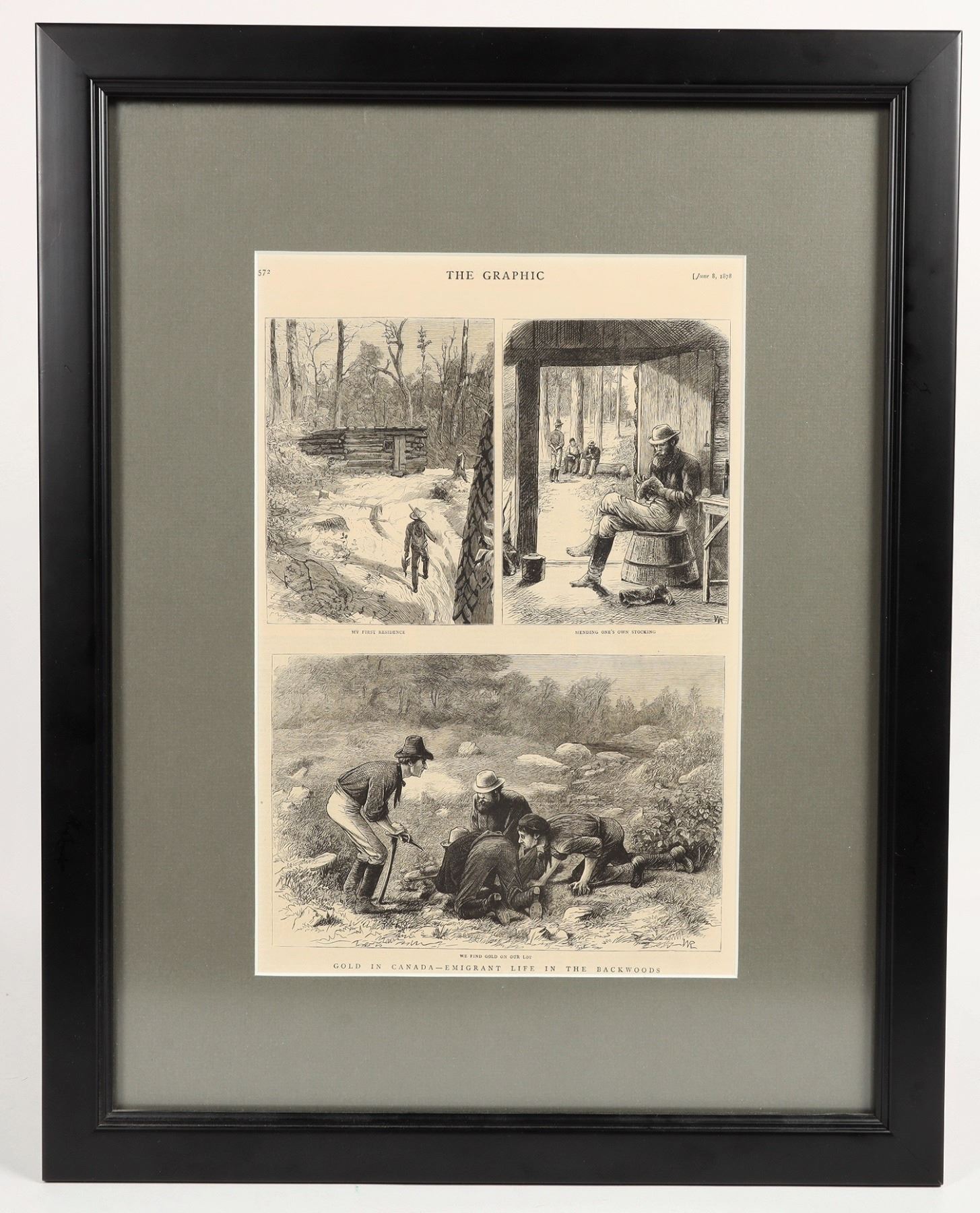 Mining related art printed on a newspaper, June 8th, 1878. Frame is in good condition with minor dents dotting an inch-long length of the left and right sides. Dent color appears to match the 1.3" thick black borders well. Gray matboard viewing window. Frame measures 27.5x22x.75", 9.5x14" subject matter. See photo.