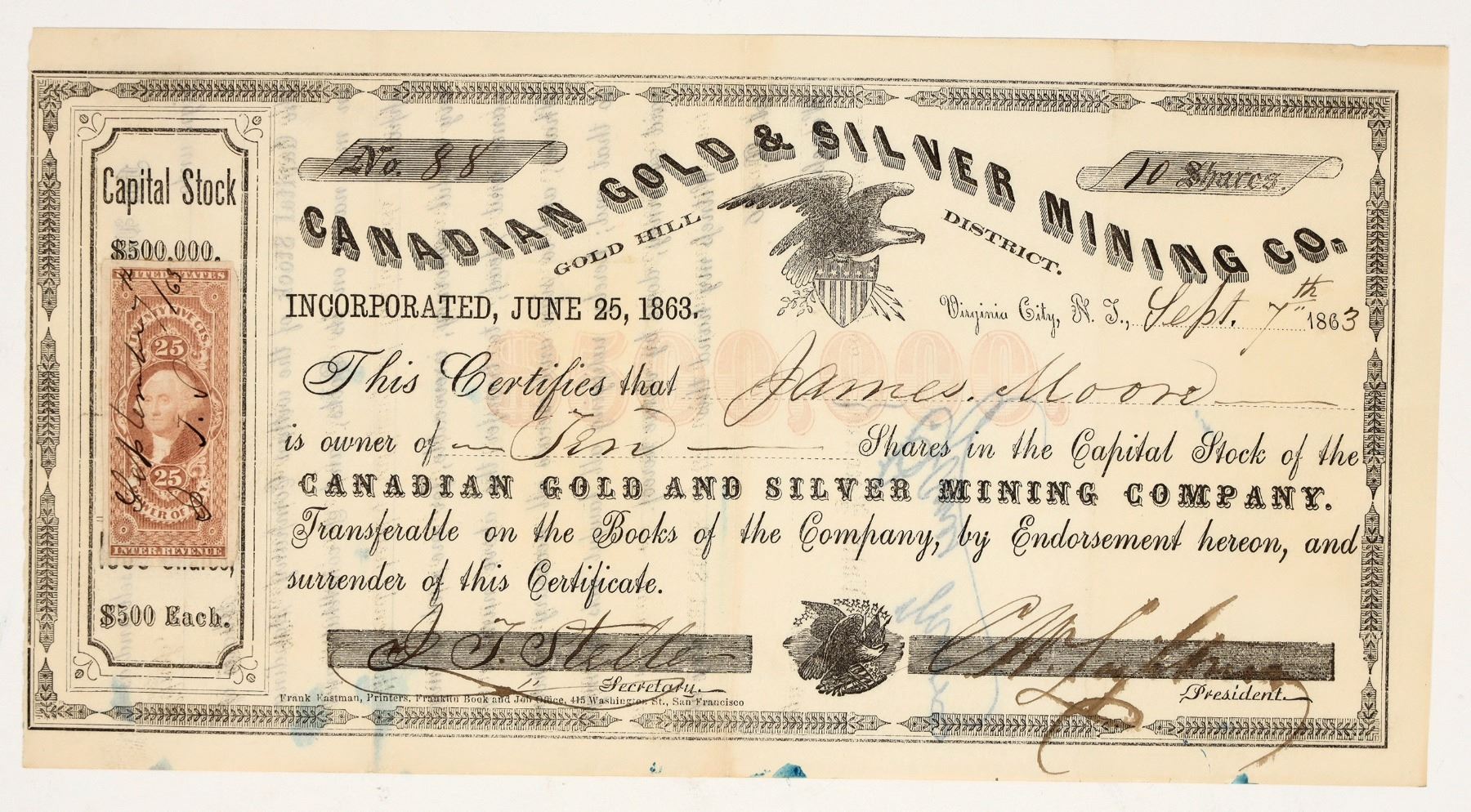 Rare; we've never offered this before. "Gold Hill District" printed under title. Inc. June 1863. No. 88, issued to James Moore for 10 shares in Virginia City. Signed by the president (CW Latham?) and secretary JT Stelle. Not cancelled. Black border and print, two eagle vignettes. 25 cent stamp at left. A few ink stains on the reverse. James Moore may have been a miner (Collins directory). Stelle is not in there. No mentions found on newspapers.com.