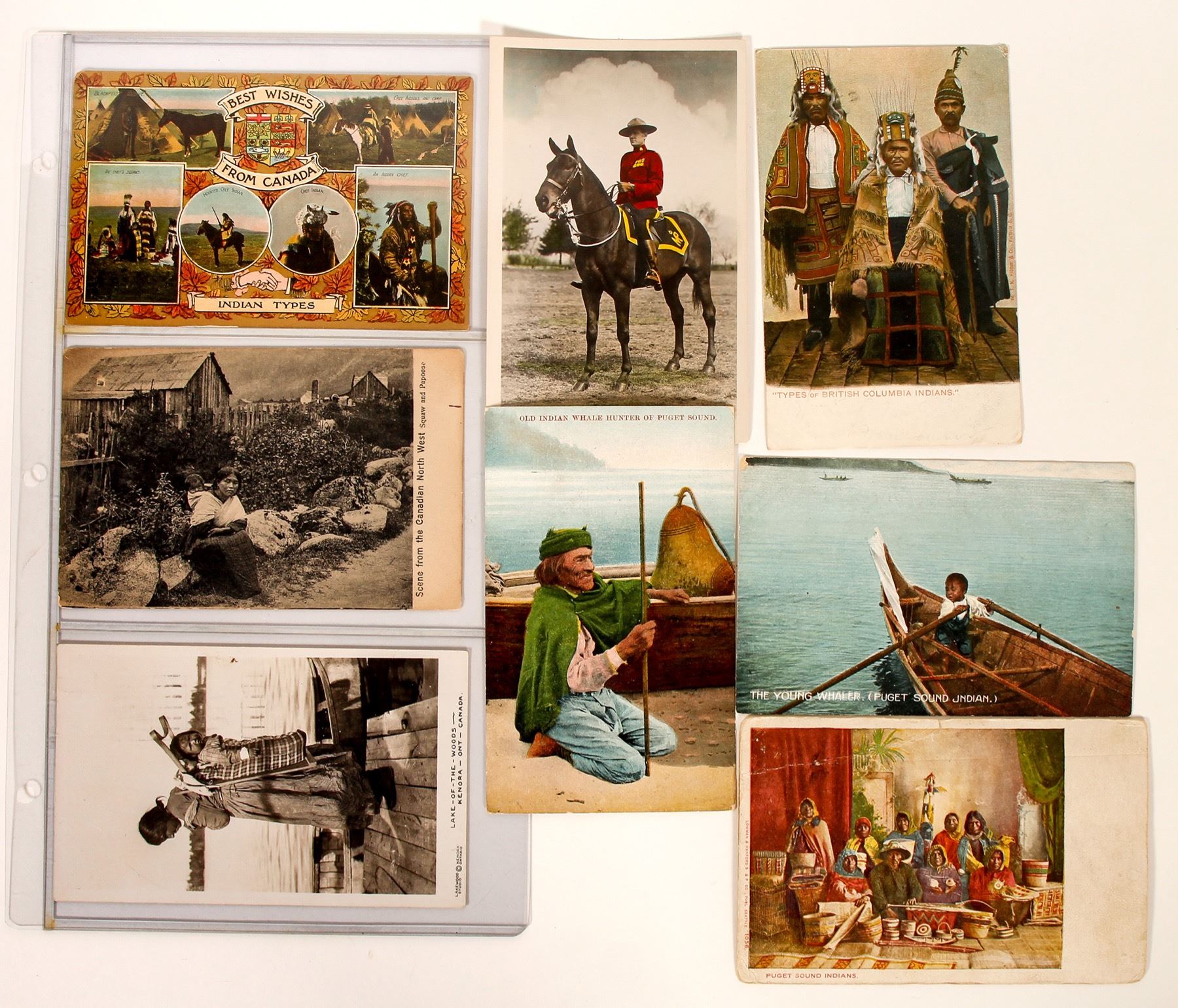 Lot of eight:four old litho; two white border RPCs; Old Indian Whale hunter of Puget Sound; Royal canadian Mounted Police; Puget Sound Indians; The Young Whaler(Puget Sound Indian); Type of British Columbia Indians." Lake of the Woods - Kenora - Ont. - Canada; Scene from the Canadian North West squaw and papoose; Indian Types / Best Wishes / From Canada.