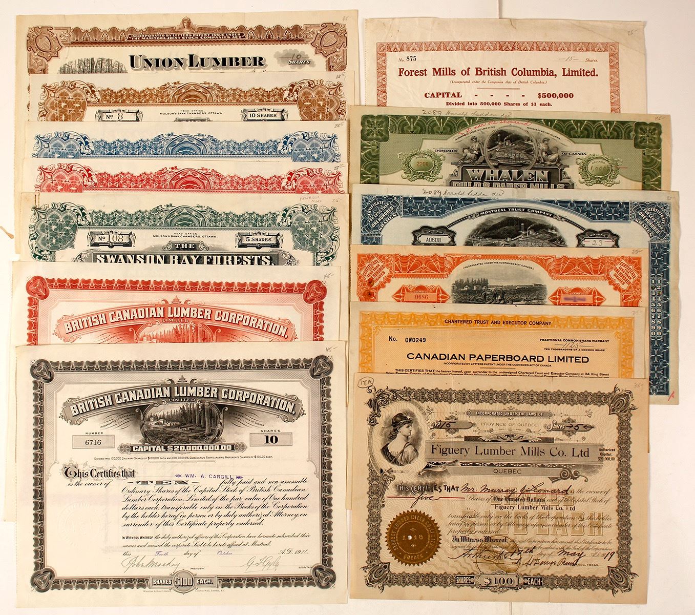 Lot of 13 stock certificates from Canadian lumber companies. Date: Location: zCanada HWAC# 63602