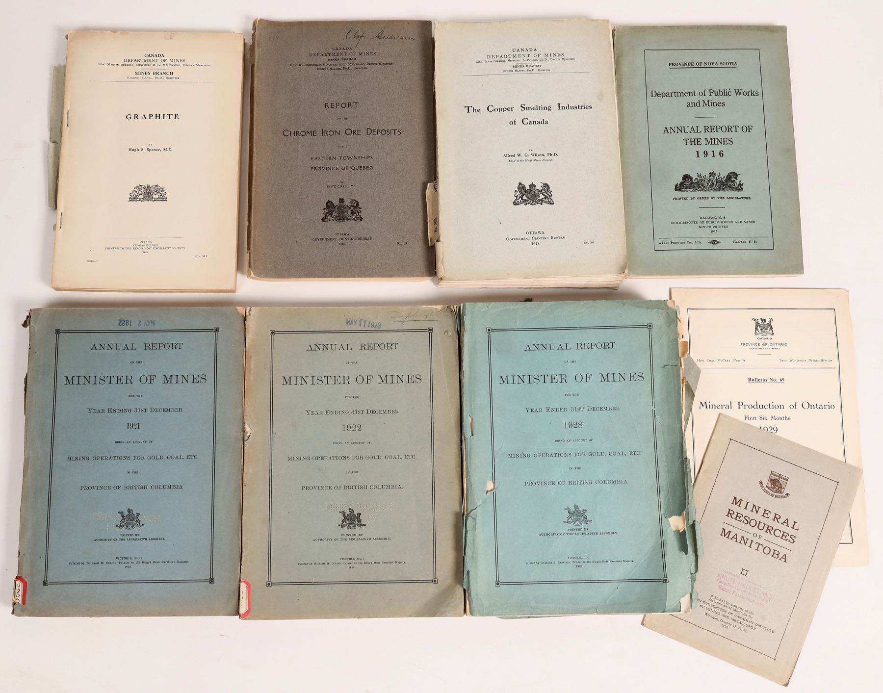 7 Canadian mine reports. 1921, 1922, 1928. 1909 Quebec Chrome Iron Ore Deposits. 1913 Copper Smelting Industries of Canada. 1920 Mineral Resources of Manitoba. 1920 Graphite, BC,. 1916 Nova Scotia Annual Report of the Mines. Some have loose or missing covers.