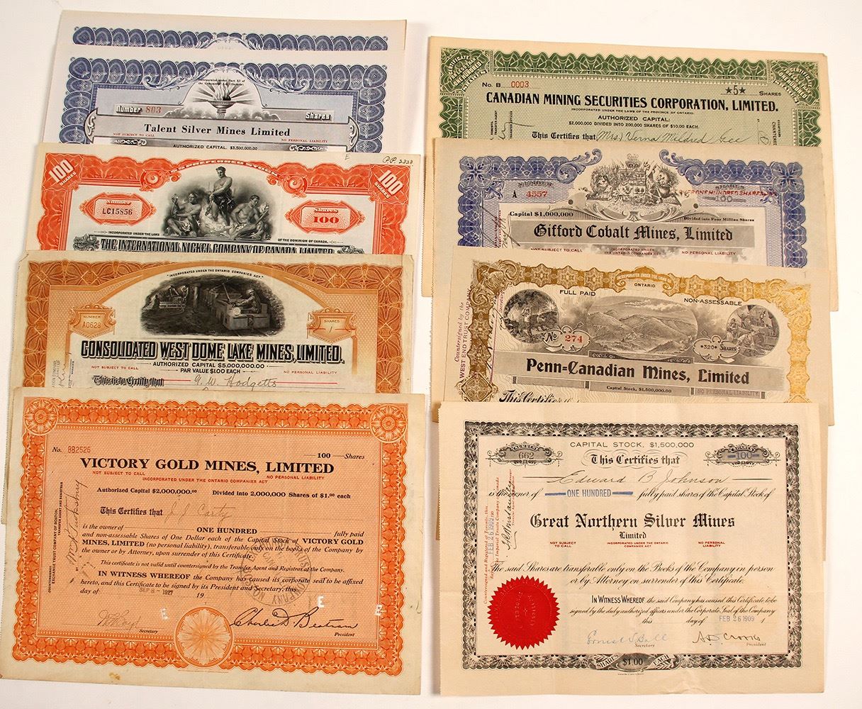 1) Consolidated West Dome Lake Mines issued 1923 #0628 1 share 2) Victory Gold Mines issued 1927 #2526 100 shares 3) Canadian Mining Securities issued 1929 #3 5 shares 4) Int'l Nickel Co. of Canada Issued 1930 #158856 100 shares 5) 6 Talent Silver Mines unissued 6) Consolidated West Dome Lake Mines issued 1923 #628 1 share 7) Victory Gold Mines issued 1927 #2526 100 shares Date: Location: Ontario, zCanada HWAC# 56151