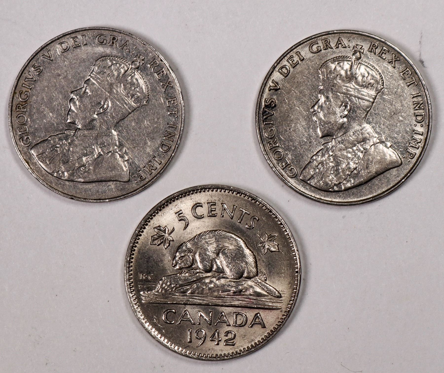 Large group of Canadian five cent pieces (about 135 coins): 1930 (3); 1931 (5); 1932 (4); 1933 (4); 1934 (4); 1935 (4); 1936 (4); 1937 (3); 1938 (4); 1939 (4); 1940 (3); 1941 (4); 1942 (4); 1942 (tombac: 7); 1943 (tombac: 12); 1944 (steel: 12 unc); 1945 (steel: 4 unc); 1946 (4; unc); 1947 (8:unc); 1948 (7); 1949 (4); 1950 (4); 1951 (12); 1952 (4); 1953 (6); 1954 (4). Lots of unc in the later dates. [ Canada 0.05