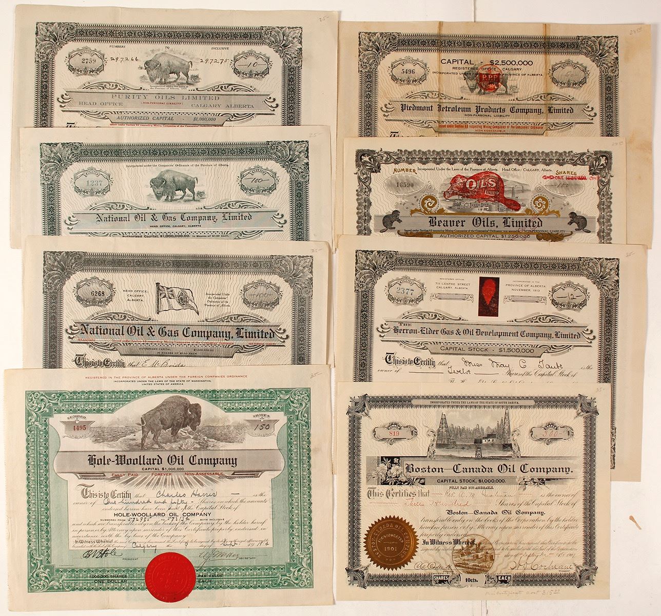 Lot of eight Canadian oil company stock certificates, all dated before 1915. Mostly Bison vignettes, with some others. Date: Location: Canada HWAC# 71002