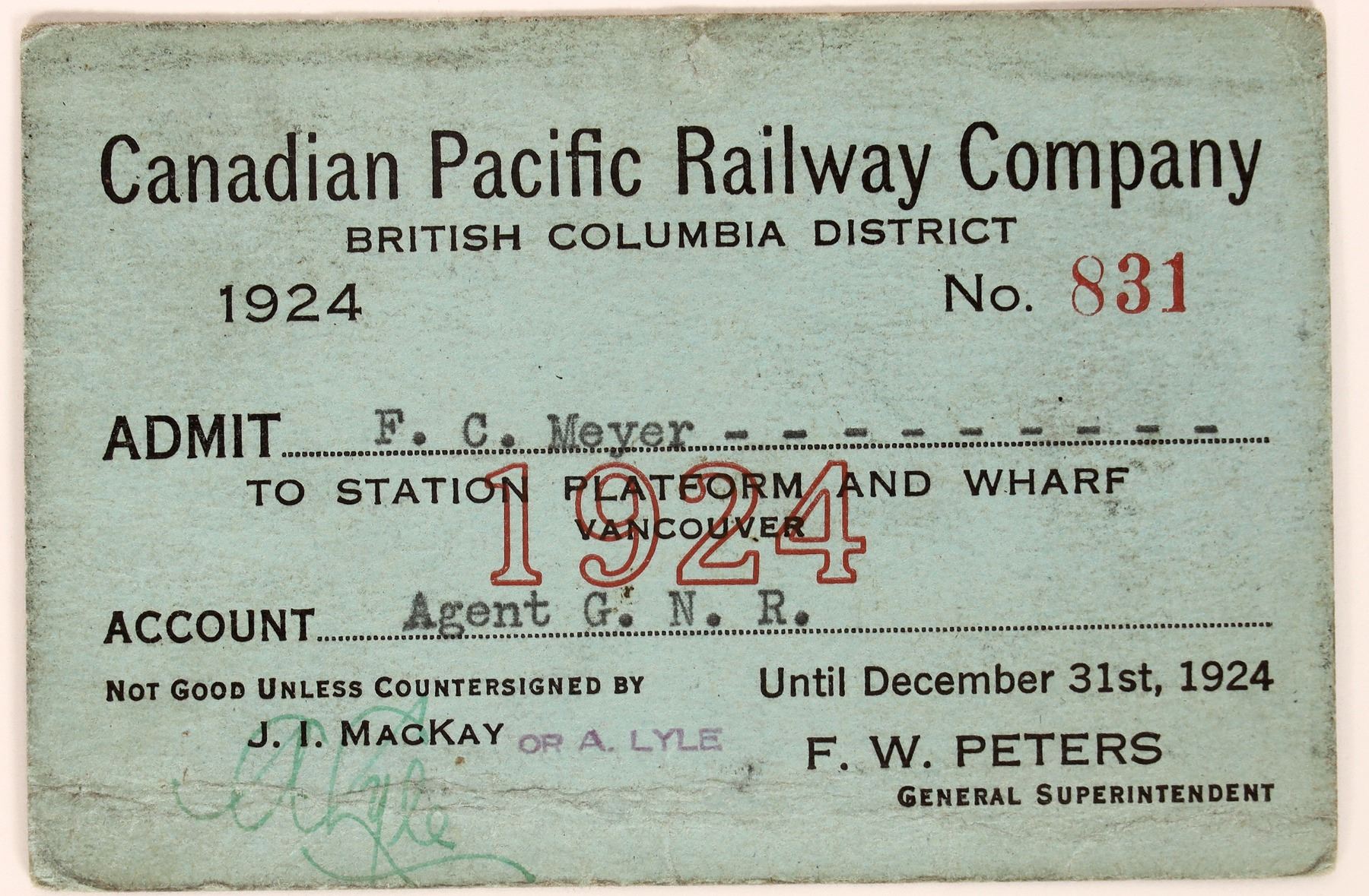 1924 Canadian Pacific Railway Co pass with printed general supt signature. Lower horizontal crease, upper foxing etc. Please inspect.