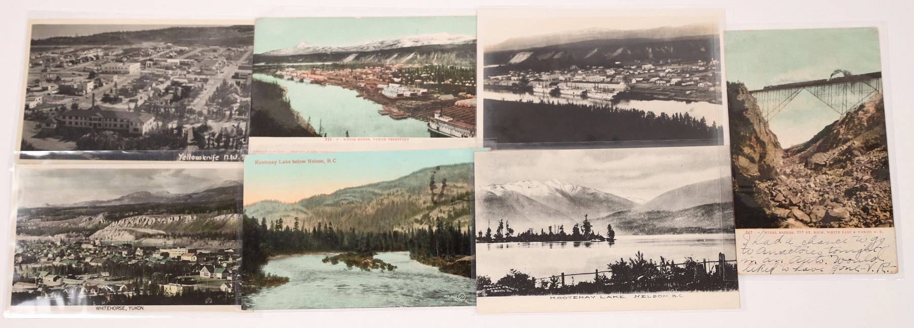 Lot of 7. 1) White Horse, Yukon Territory. Three cards, including two real photo and one printed by Mitchell. Bird's-eye views. Also printed card by Mitchell for steel bridge of the White Pass & Yukon Railroad. 2) Yellowknife, Northwest Territories. One real photo postcard, bird's-eye view. 3) Nelson, British Columbia. Two scenic printed cards of Kootenay Lake.