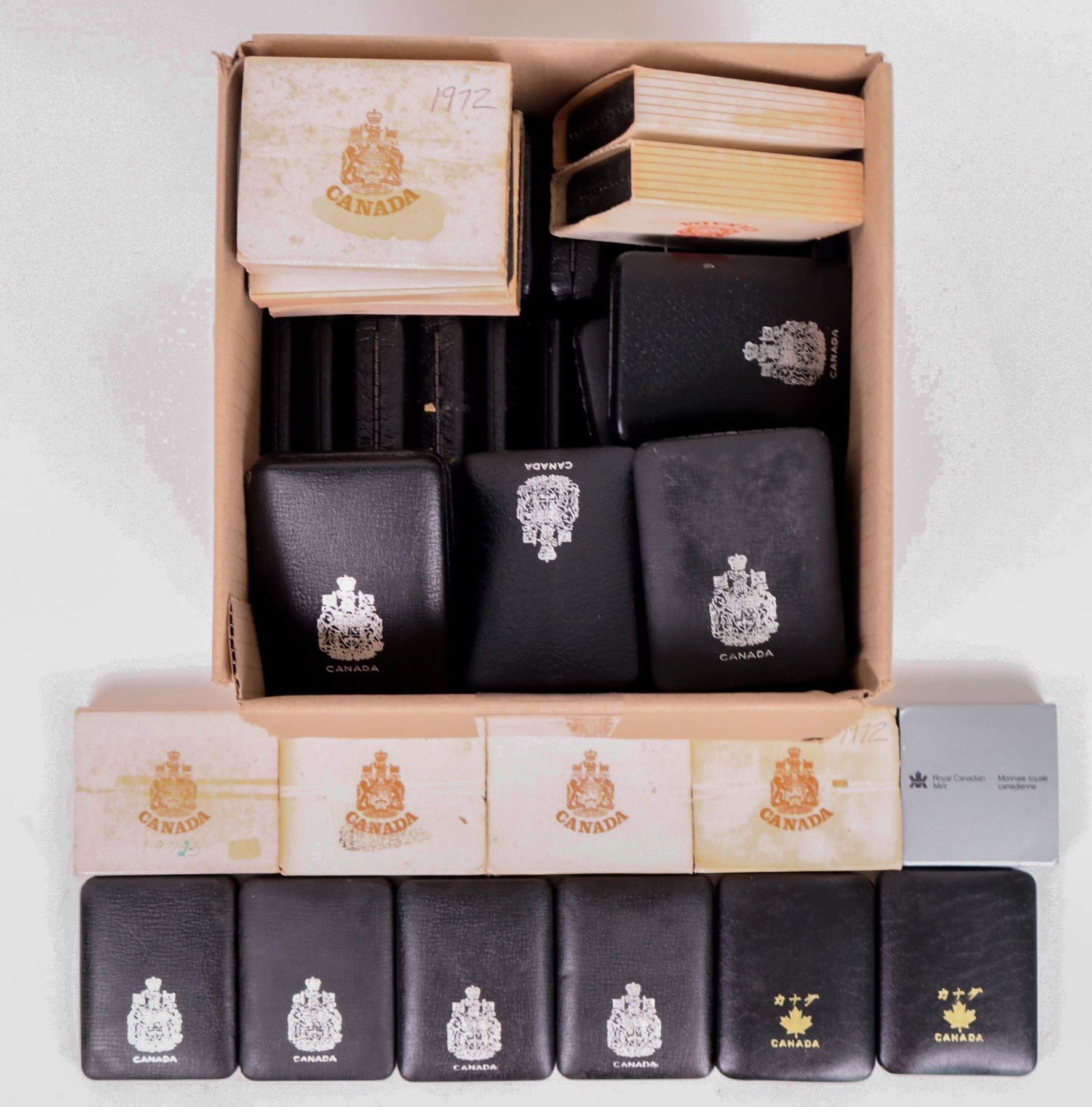 Original Royal Mint packaging of 77 Canadian silver proof one dollar coins: 1970 (2); 1972 (20);1976 (20); 1979; 1982; 1983 (12); 1984 (17); 1985; 1986; 1988 (2). About 28.8 ounces of silver.