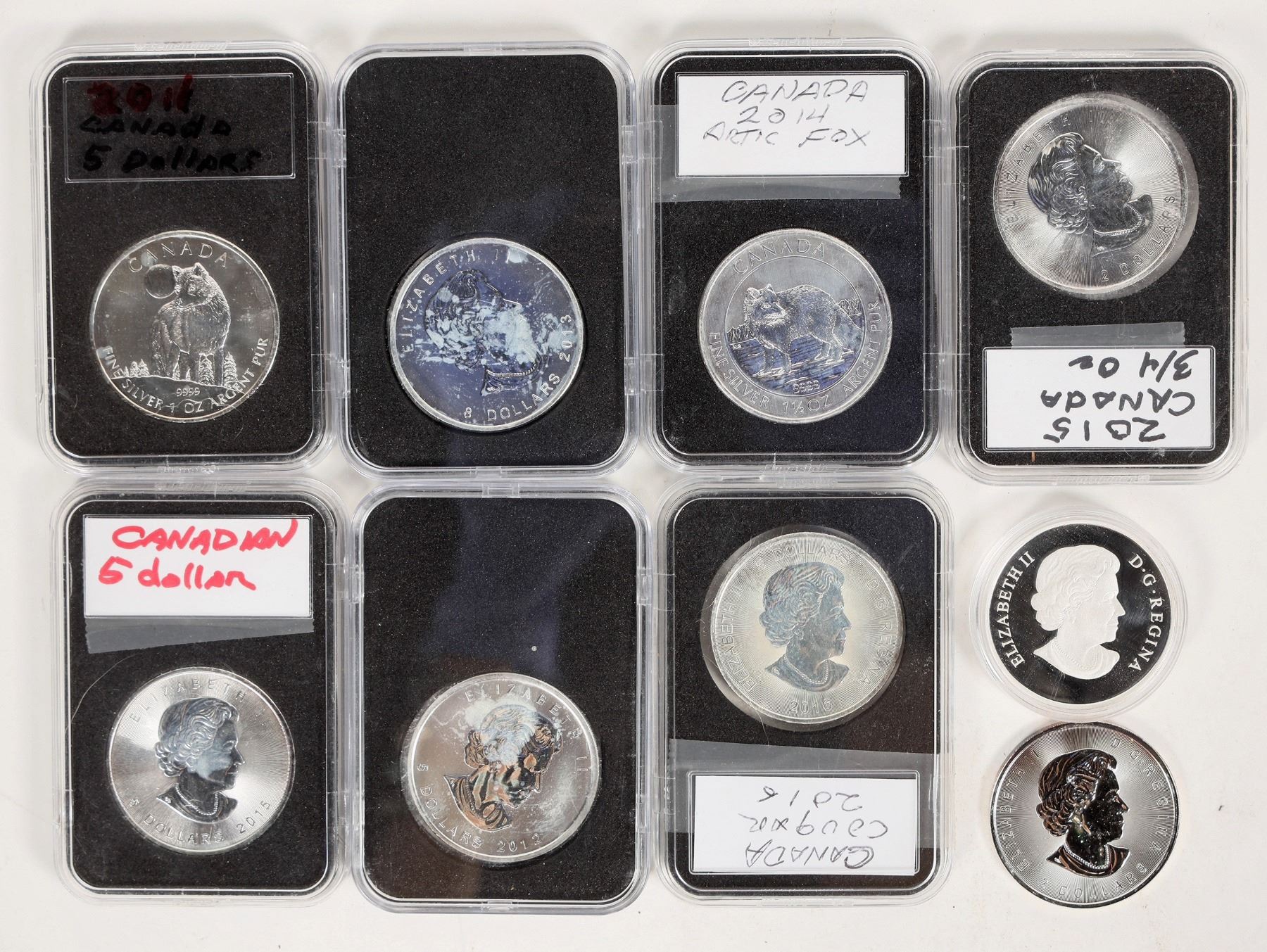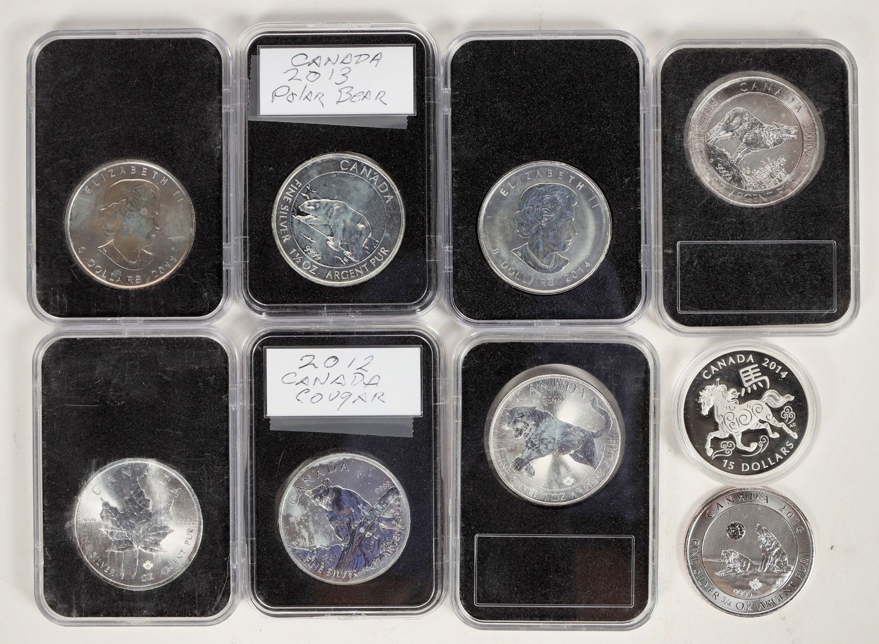 Nine brilliant uncirculated Canadian silver coins: 2014 Year of the Horse $15 in original box with paperwork (just under one ounce); 2014 Arctic Fox (1 1/2 oz..); 2013 Polar Bear (1 1/2 oz.); 2012 Cougar (1 oz.); 2011 Wolf (1 oz.); 2015 five dollar (1 oz.); 2016 Cougar (1 oz.); 2015 Wolf (3/4 oz.); 2016 Wolf (3/4 oz.) .