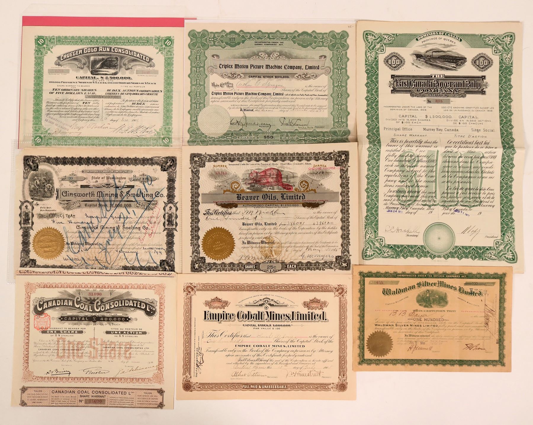 Great group of Canadian stocks from the mining, oil, motion picture industries. Iincludes: Triplex Motion Picture Machine Company, 1921 (Quebec), Crueger Gold Run Consolidated, Ltd. 1905 (Nova Scotia), Empire Cobalt Mines, Ltd. 1908 (Cobalt district), Canadian Coal Consolidated, Ltd. 1910, Beaver Oils, Limited 1915 (Alberta) with red beaver over the oil derricks vignette, and East Canada Power & Pulp Company, 1911, Ainsworth Mining & Smelting Co. 1897 (British Columbia) with large cancel marks, 1910. Seven mining vignettes. Tiny piece missing at top left corner, & Waldman Silver MInes, Ltd. 1910 (Ontario).