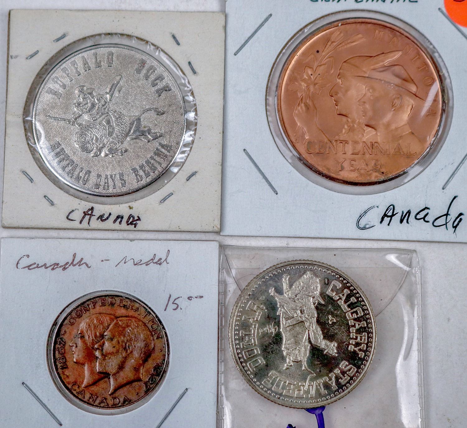 Group of 4 Canadian commemorative medals and tokens. Lot includes a Manitoba Centennial medal, a 1966 trade token, a 1927 medal celebrating Canadian confederation, and a token celebrating the U.S. bicentennial from Calgary. All in good condition; see photos.