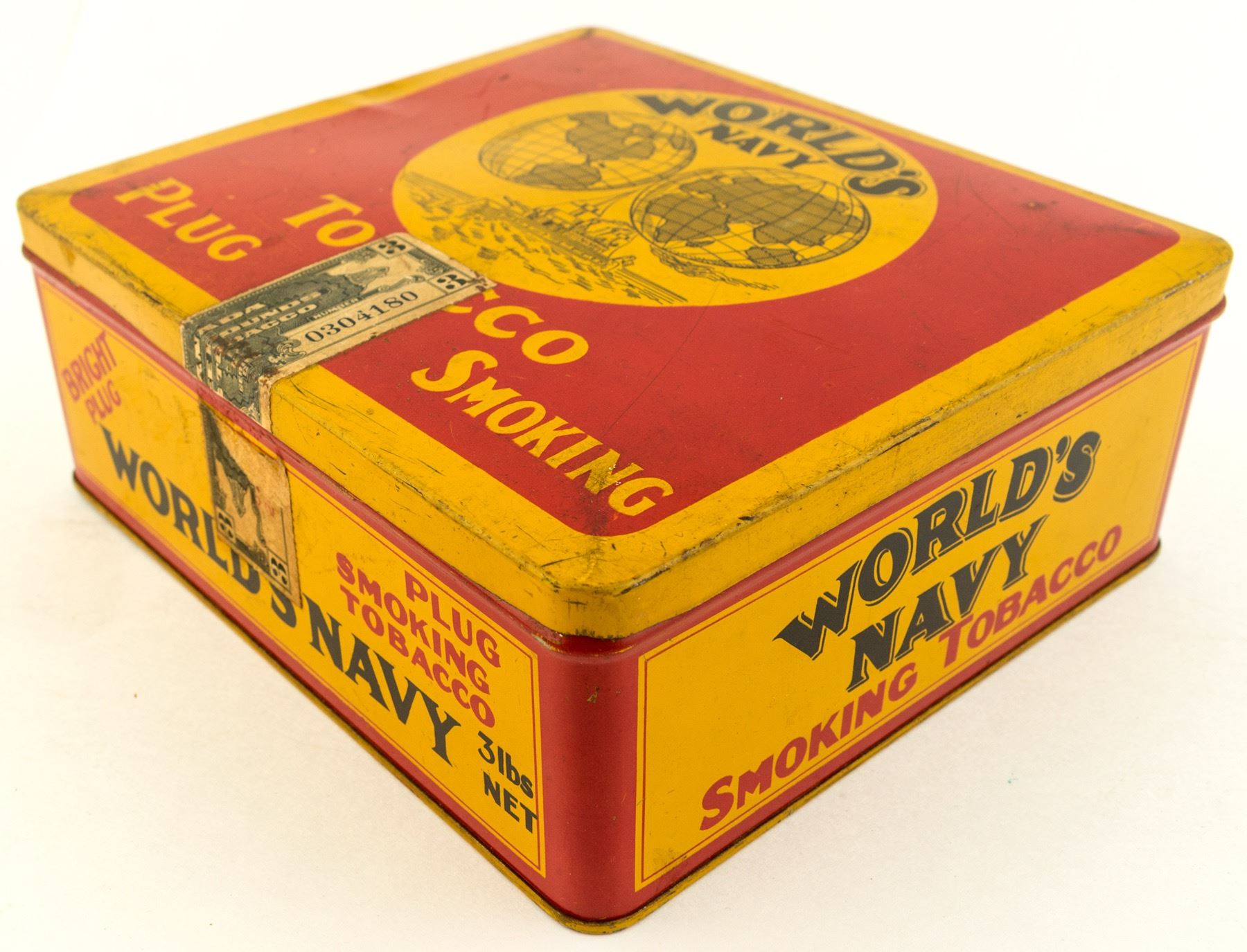 World's navy Smoking Tobacco 3 lb. Canadian Advertising tin from the 20s or 30s , approx 8 inch by 8 inch. State: City: HWAC#: 48302 Date: