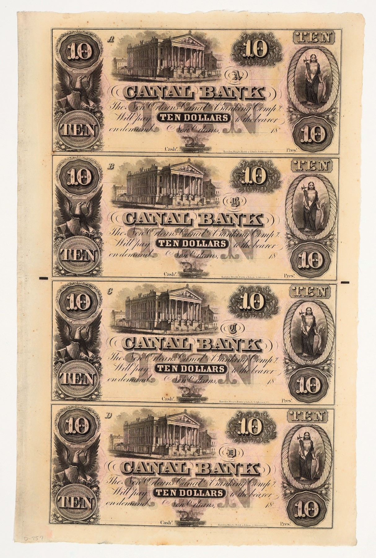Sheet of four uncut, unissued ten dollar bills from the Canal Bank of New Orleans, which operated from 1830s-1860s. View of the bank building center and patriotic side vignettes. 8 x 13 inches.