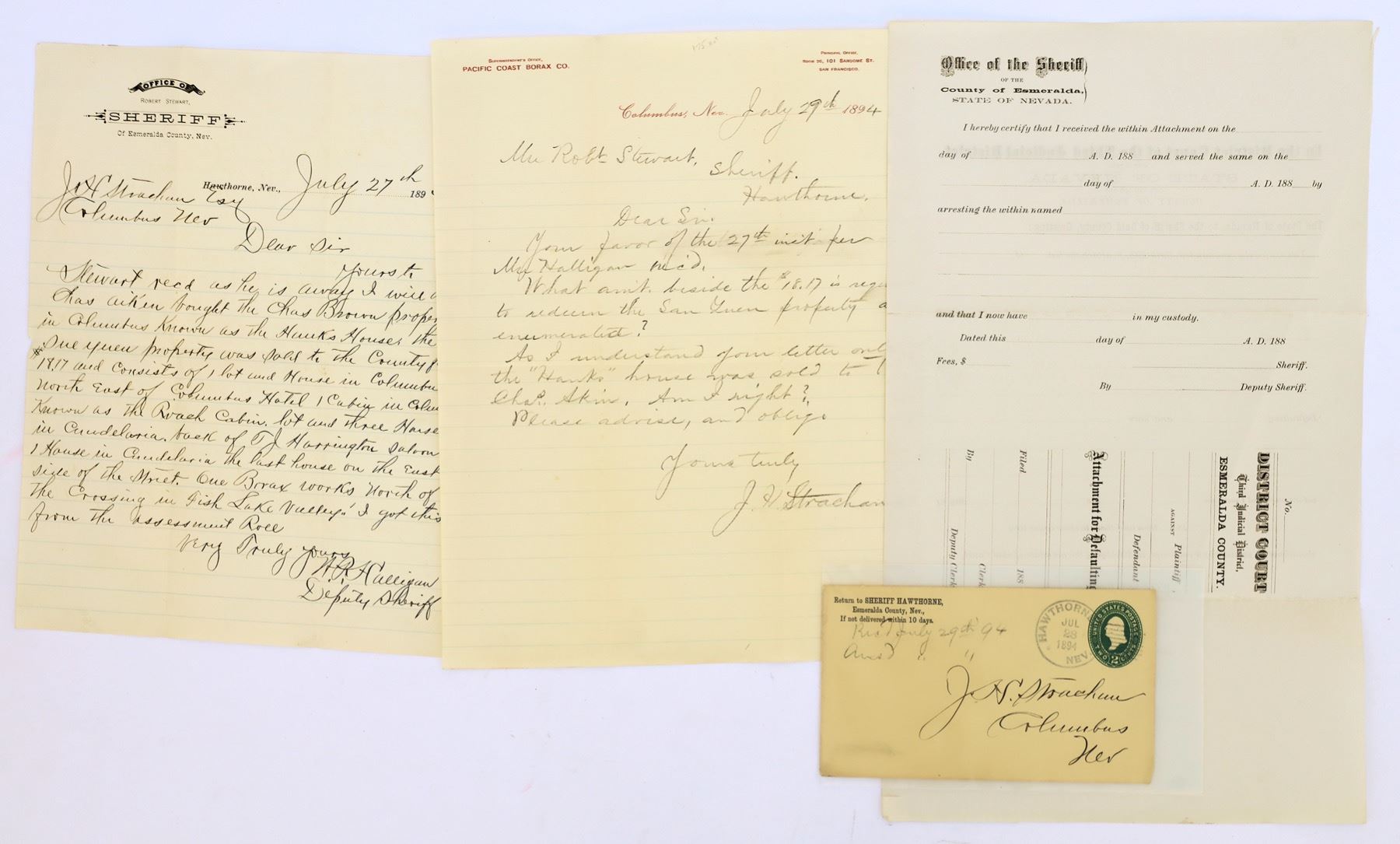 1) Hawthorne. Rarity-1, Nearly perfect strike. CC of "SHERIFF, HAWTHORNE." 2) Candelaria on reverse. Rarity-4. Excellent strike. First letter is from JH Strachan with the Pacific Coast Borax Company letterhead (in red), superintendent's office, Columbus. He is asking about purchasing land and buildings for back taxes including Hawks House in Columbus, last house on the east side of the street in Candelaria, borax works in Fish Lake Valley, etc., Strachan asks for more information. Deputy Sherriff Halligan answers on official Sheriff's Letterhead (Robert Stewart, Sheriff). Halligan gives information on the Roach Cabin, house NE of the Columbus Hotel, Charles Brown property (Hawks House), property and three horses behind the TJ Harrington saloon, etc. Two outstanding cancels, two letterheads, great content! Notes on Strachan (superintendent of the Teel March Borax Works), Pacific Coast Borax Co. and Halligan.