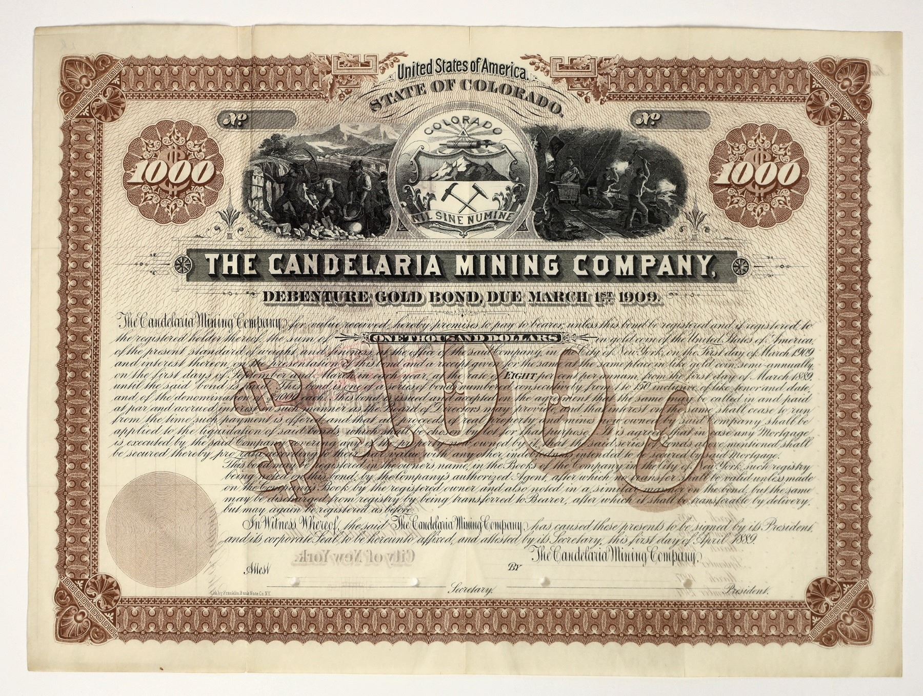 Specimen bond, $1000, 1889. Franklin Bank Note Co., NY. Inc. in Colorado. According to 1889 newspapers, this company bought 1500 acres of mining property in Northern Chihuahua belonging to the Great Corralitos Hacienda. Approx. 9.5 x 13"