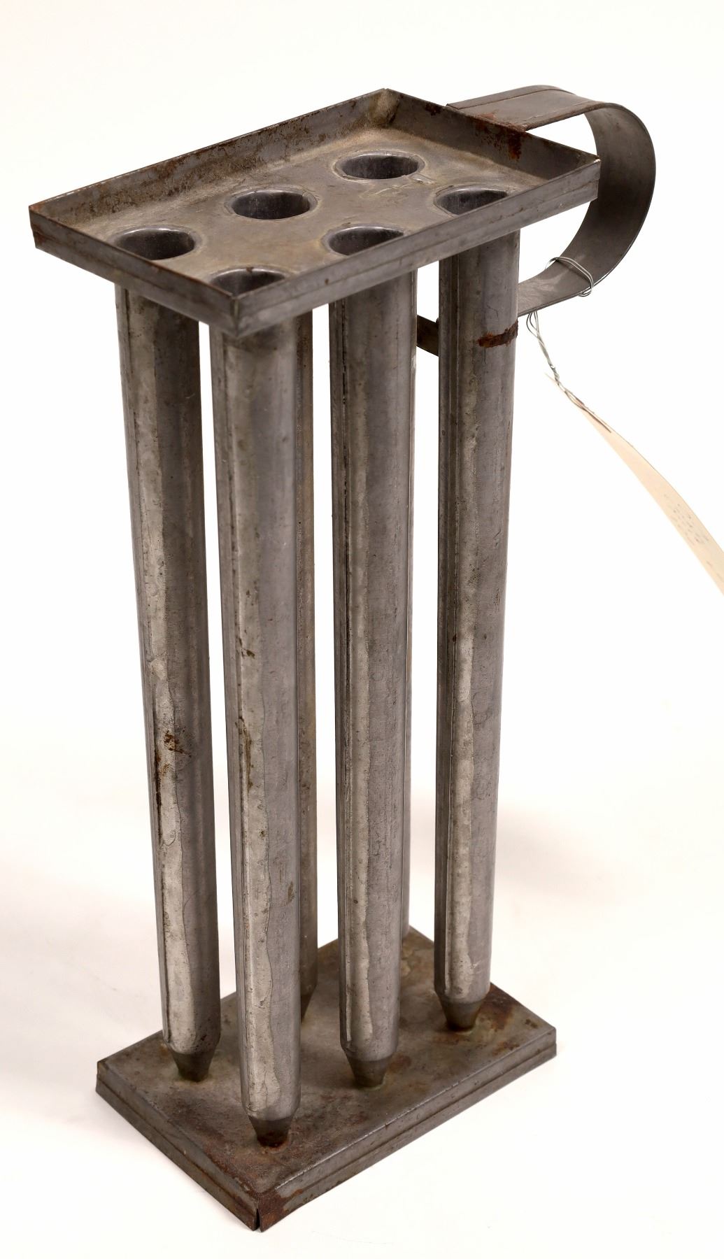 Mold for making 0.7-inch diameter wax candles, up to 10.5 inches long. Magnetic, appears to be made of galvanized steel. Overall dimensions are 7 x 3 x 11 with the handle. No apparent damage, so you could start your own candle-making business!