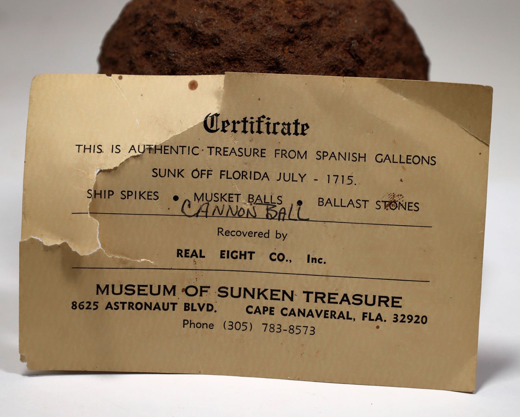This cannonball measures at 4 in. in diameter and weighs 6.4 lbs. was retrieved from a Spanish Galleon sunken in 1715 off the Florida coast. The ball is solid with pitting consistent with carbon and iron loss. A certificate of authentic treasure from Real Eight Co. Inc. is included.