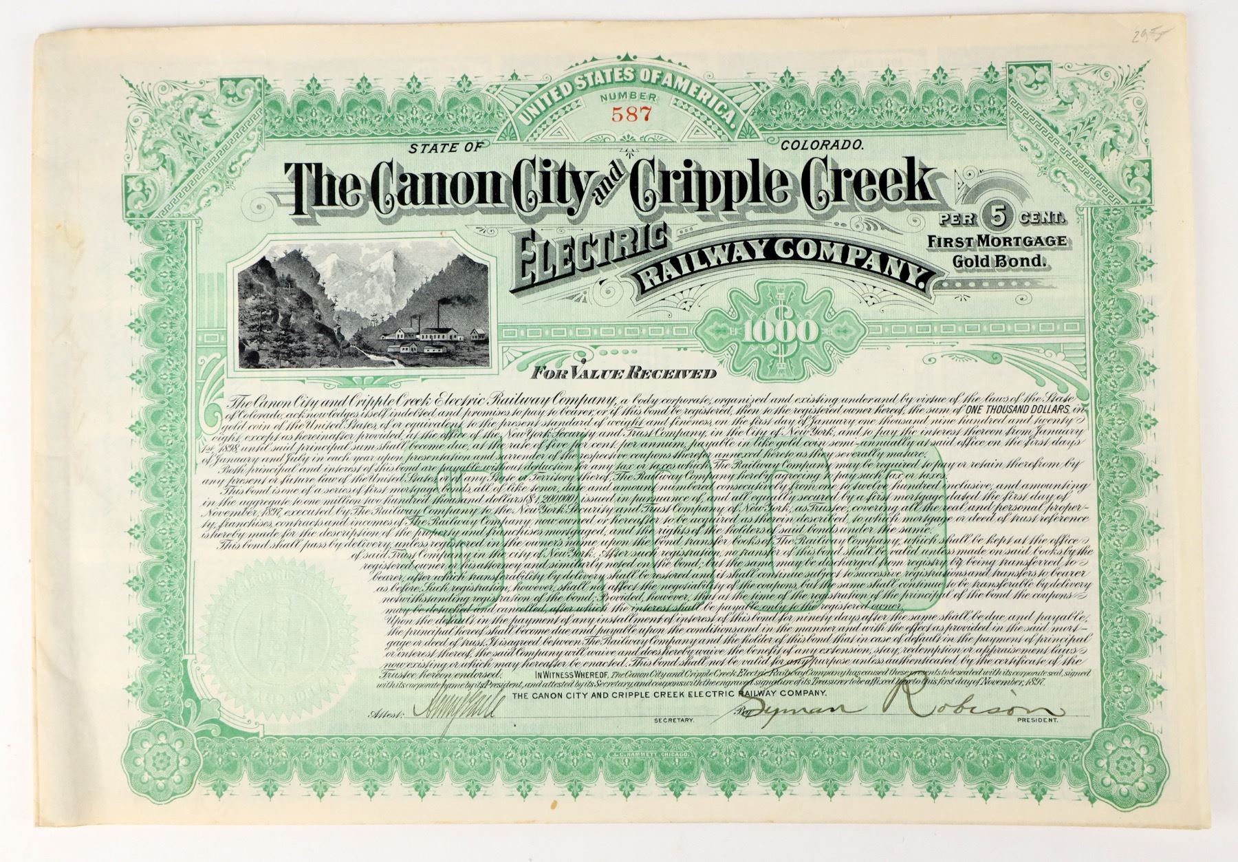 Rocky mountain vignette, green ink, signed by Lyman Robison, President. $1000 first mortgage gold bond issued by The Canon City and Cripple Creek Electric Railway Company in 1897.