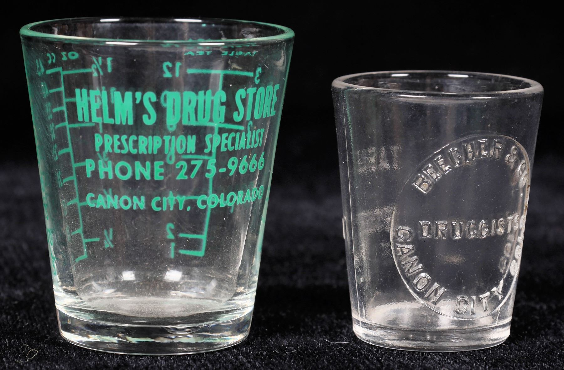 Helm's Drug Store/Prescription Specialist/Phone 275-9666/Canon City, Colorado 2.25". Beecher & Co./Druggists/Canon City Colo 1.8". No apparent chips or cracks. Reed Collection.