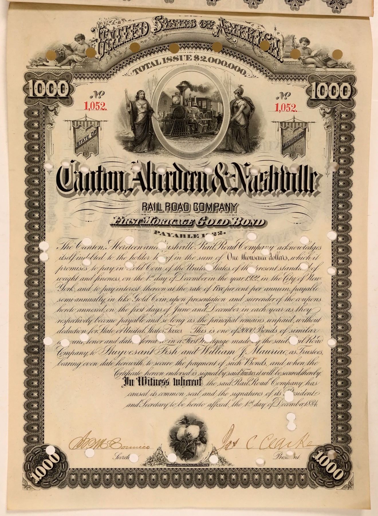 1st Mortgage gold bond #1052, issued in 1884. $1,000. Two females flank a train in a circular oval. Black on creme. Heavily hole punched as is usual with this one. ABN, New York.