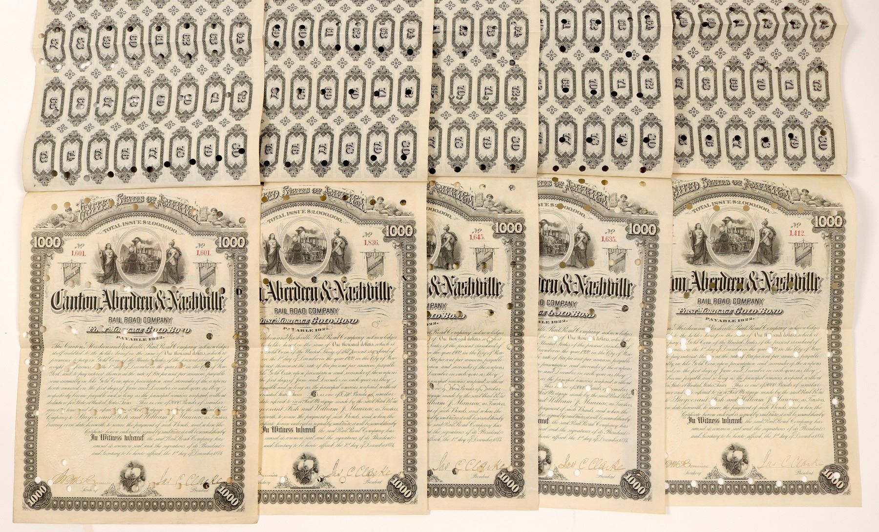 Cancelled 5 Canton, Aberdeen and Nashville Railroad $1,000 5% 1st Mortgage Gold Bonds. Principal payable 1922. Each has 70 unpaid coupons remaining. Signed by president and secretary. Inc. on Feb. 17, 1882. Predecessor: Canton, Kosciusko, Aberdeen & Tuscumbia Railroad. Successor: Illinois Central. Vignette: Train in oval with male and female allegorical figures outside oval on bond page. Route went from Durant to Aberdeen and Winfiled to Brilliant, AL. Printed: American Bank Note Co. N.Y. L