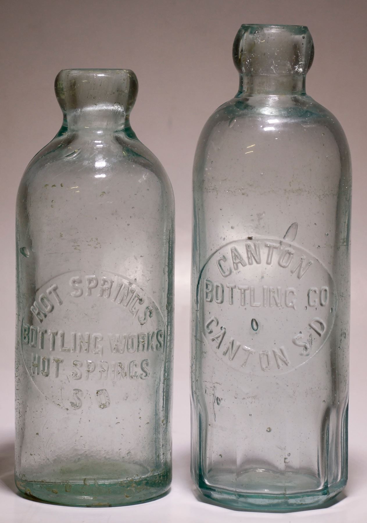 ( Both bottles are embossed in a round slug plate, on the front of the bottle) . Lot # 1 of 2: Canton ( au) / Bottling Co. / Canton, S.D ( ad ). // Aqua, Hutchinson style soda. 7 1/4" tall, 10 sided mug base, and fairly clean and shiny, but does have a little caseware. Base: Embossed # 25. Also, a few nice bubbles in the back of the bottle. . A nice looking piece. Lot #2 of 2 : Hot Springs ( au ) Bottling Works / Hot Springs/ S.D. ( ad) // Aqua, hutchinson style soda . 6 1/2 " T all, cleam and shiny. Medium amount of overall wear, and scratches. But, 1 1/4" base repair, as well roughness in that area. Nice pair... Date: 1890's 1900. City: Canton / Hot Springs/ State: South Dakota HWAC# 76018