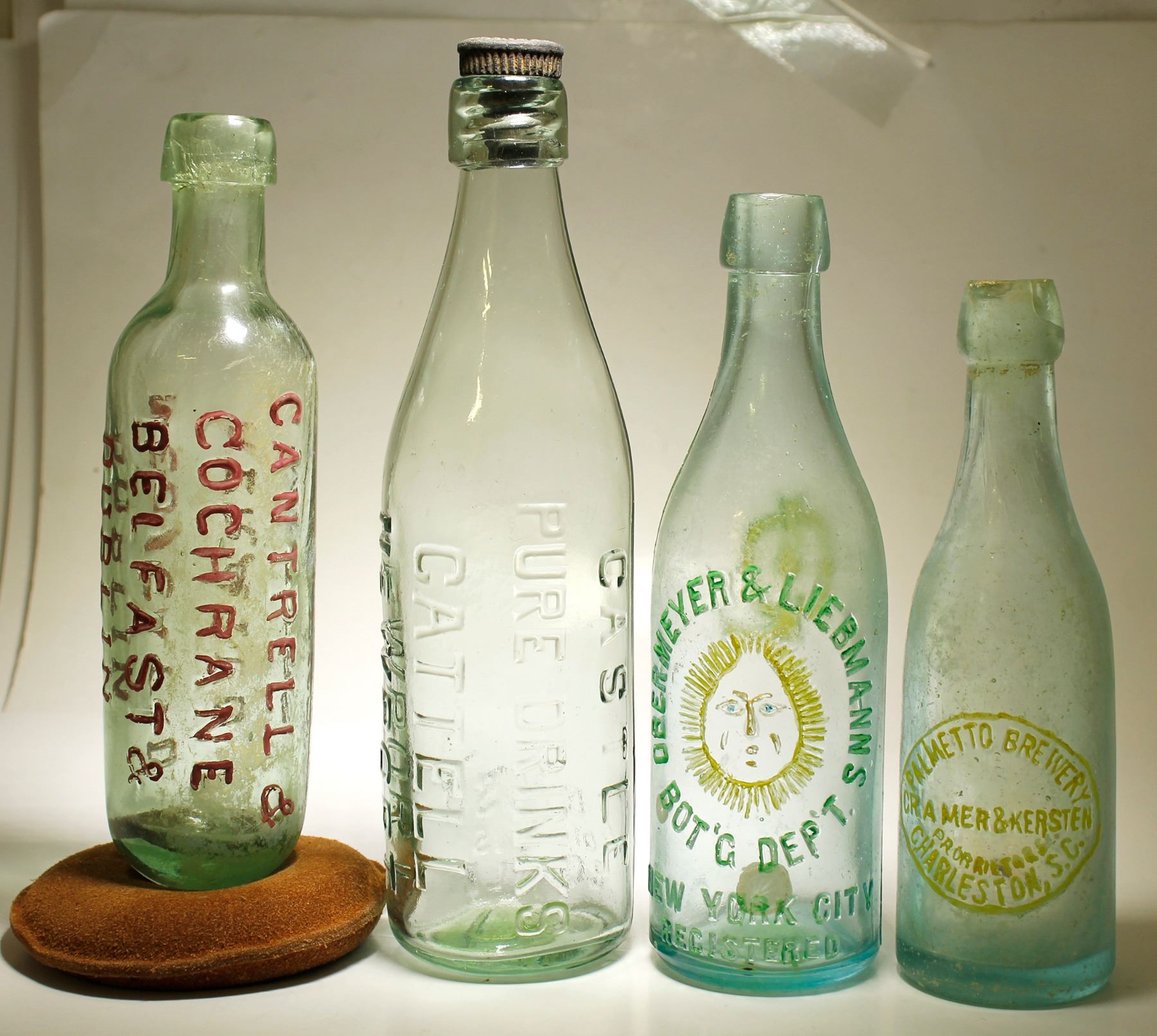 Item # 1 of 4 : ( Embossed vertically ) Cantrell & / Cochrane / Belfast &/ Dublin / Medicated / Areated / Waters. // Aqua, round bottom soda, applied top. 9 " tall, and stained . This is a dug specimen, and has some scratching and wear as well. Also, alot of stress makes in the neck of the bottle. No Cracks or chips. Item # 2 of 4 :( Embossed vertically ) Castle / Pure Driks / Cattell / Newport // Reverse at the base : 1/2 d Deposit / On This / Bottle // Base : " C"// Aqua, inside screw threaded drink bottle. 10 1/4" tall, applied top.. Perfect, like a brand new bottle, clean and shiny. Item # 3 of 4 : Obermeyer & Liebmann's ( au ) / Motif: Whiskered Face " BOT"G Dept. / New York City/ Registered //Reverse: Embossed with giant block letters: O & L intertwined // Aqua , blob top , beer bottle, tooled top . 8 7/8" tall , and is a dug bottle. It has some wear and light scratching, in the body of the bottle. But, no major chips or cracks. All the embossing, has been painted, and can be removed easily. Item #4 of 4 : Embossed on the front of the bottle, in an oval slugplate is : Palmetto Brewey ( au ) / Cramer &Kersten / Propritors ( ad) / Charleston , S.C. // Reverse: This Bottle / Not To / Be Sold / Return When Empty // Aqua , slope shouldered , tooled top. Dug , and badly damaged , with cracks in the top, and chpis . Also heavy wear and stainung. Nice grouping of different shaped bottles. ( RH ).