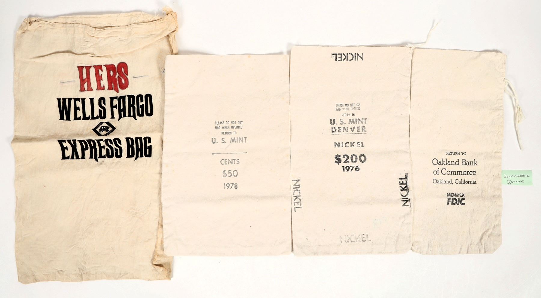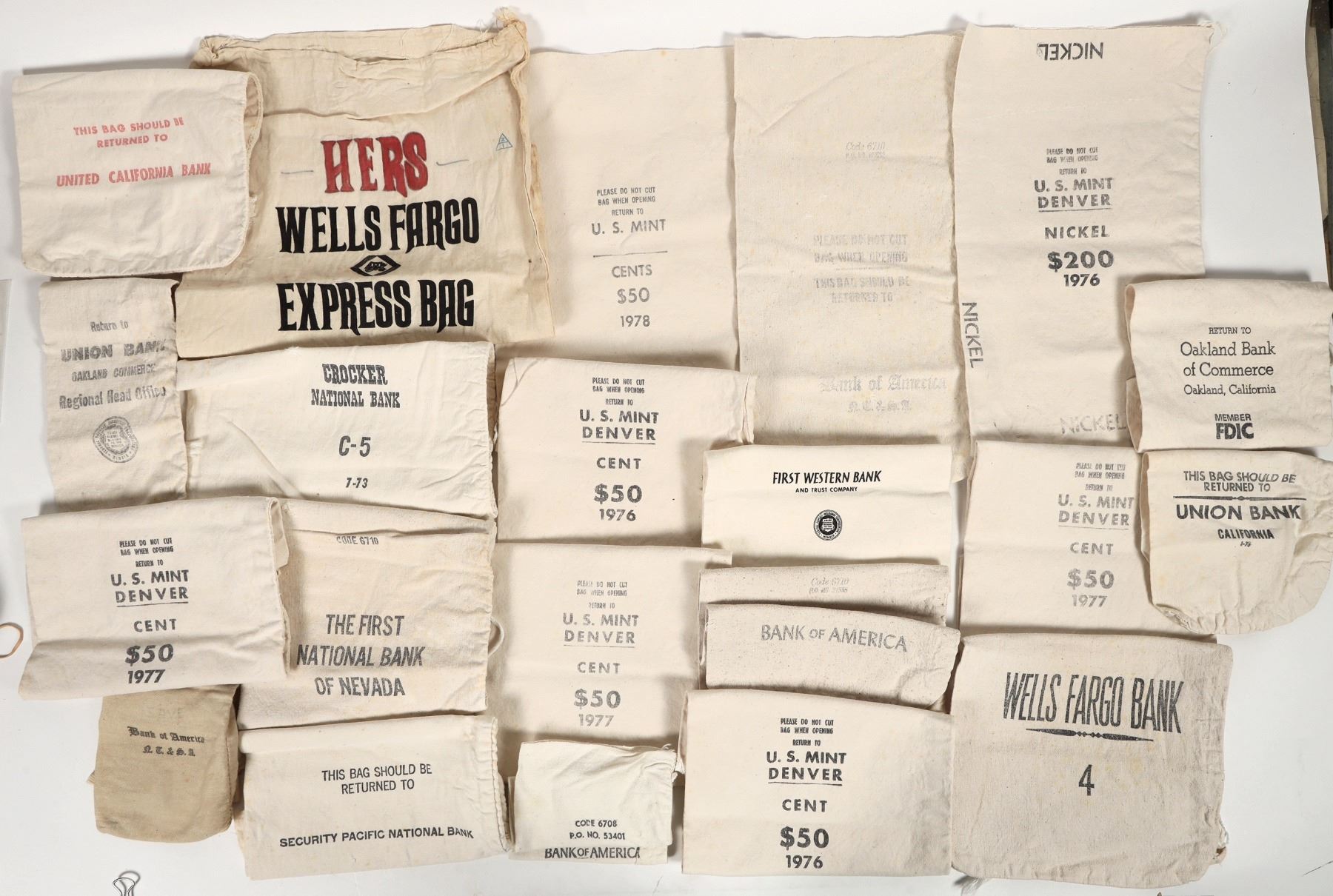 Twenty one canvas bank bags, mostly all 1000 coin bags; only 4 small bags. Currency: Wells Fargo, Crocker National Bank. Coin: Bank of America; Union Bank, Cal.; U. S. Mint, Cents, 1978; U. S. Mint, Cents, Denver, 1976; Oakland Bank of Commerce; Union Bank, Oakland Commerce; United California Bank; Security Pacific National Bank; 1st National Bank of Nevada; U. S. Mint, Denver, Cents, 1977; First Western Bank; U. S. Mint Denver, Nickels, 1976.