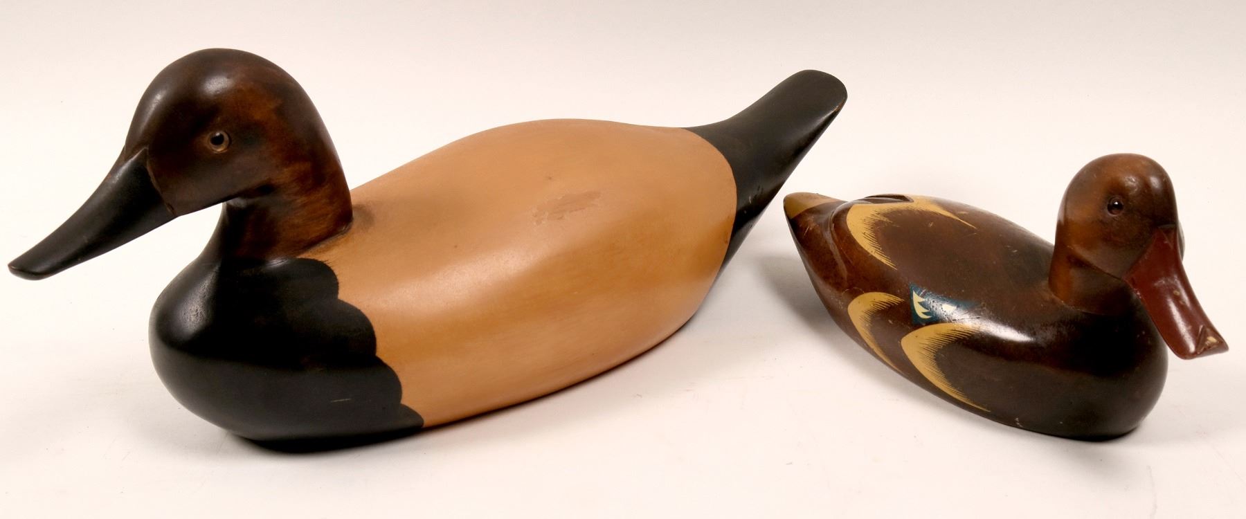 This is a lot of two decoys; a Canvasback drake at 15 in. overall length, and a second decoy of a Mallard hen at 9 1/2 in. overall length. These are display decoys and non-functional. Both decoys are unsigned. The Canvasback is full sized and partially restored on a dense wood. The second is the Mallard hen of walnut with a varnish finish over paint. Both are in very good condition.