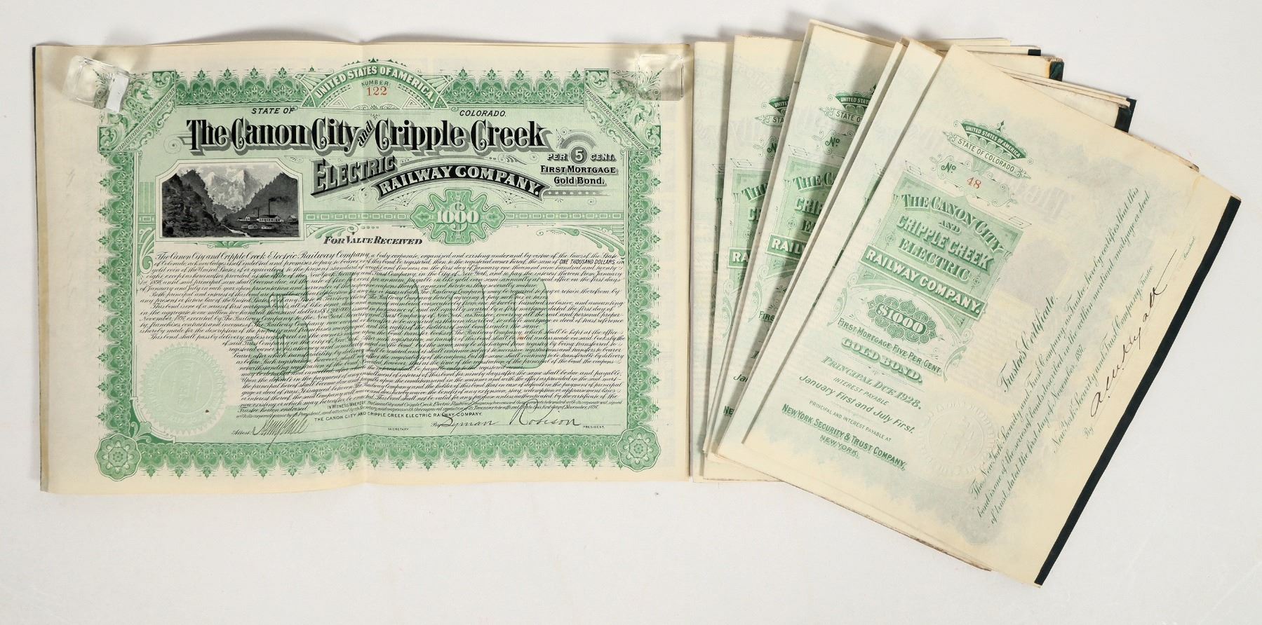 Lot of 9. I/U. Issued 1897. EF cond. The Canyon City And Cripple Creek Electric Railway Co., $1000, 5%, gold bearer bonds, coupons attached. L.C. Hammet printer.