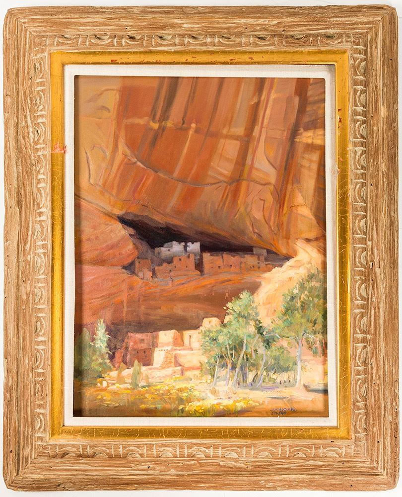 Canyon De Chelly--"White House Ruin" oil painting by Sherry Blanchard Stuart. Painting is 24" x 18", framed 34" x 28". Signed by the artist. Painting was damaged during transit, repaired. Frame also damaged during transit. Price reflects the damage. A resident of the Sonoran desert of north Scottsdale, Arizona, Sherry Blanchard Stuart is a traditional painter of landscapes, figures, equine subjects and still life. She earned a BFA from the Minneapolis College of Art and Design. Stuart paints mountains and desert landscapes as well as wildlife, cowboys and ranch scenes. She particularly enjoys painting horses and finds grooming and riding her own horse helps her to capture the animal's beauty. She finds that being an artist in Arizona is appealing because of "the light, the openness, the vast distances you can see, the mountains, and the atmosphere of the desert. Also it is good to have nice weather so much of the year so you can go out and paint." Date: Location: Arizona HWAC# 56827