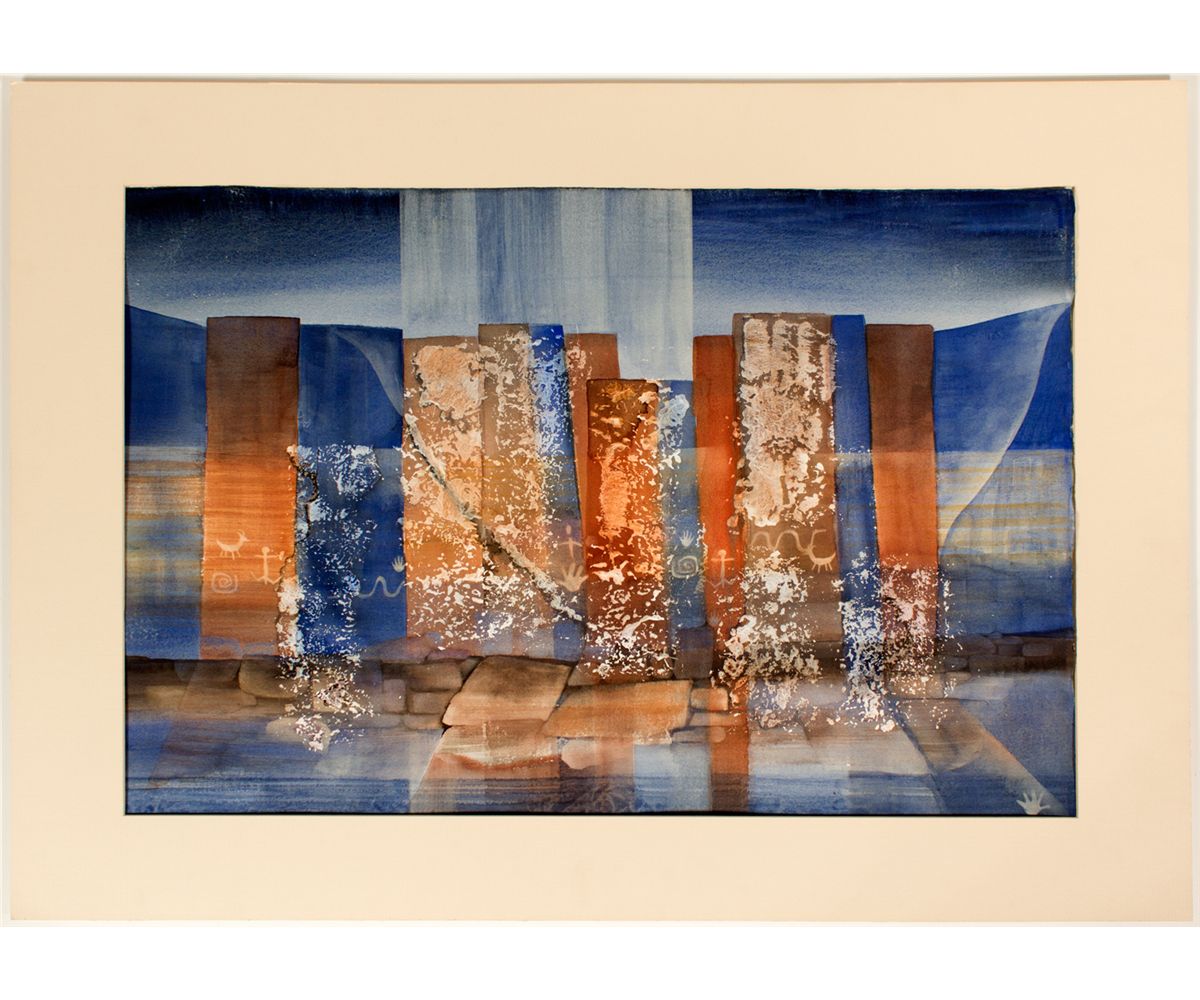 30 x 22" watercolor by Ruth Hilts. A Native Nevadan, Ruth Hilts worked in several mediums over the years. The paintings reflect her love of the high desert country. She is noted for her "Nevada Earth' series in which she made pigments from soils, rocks and minerals of the Nevada desert. She has received several awards for her work, and her paintings are in many corporate collections, including the Nevada Museum of Art.