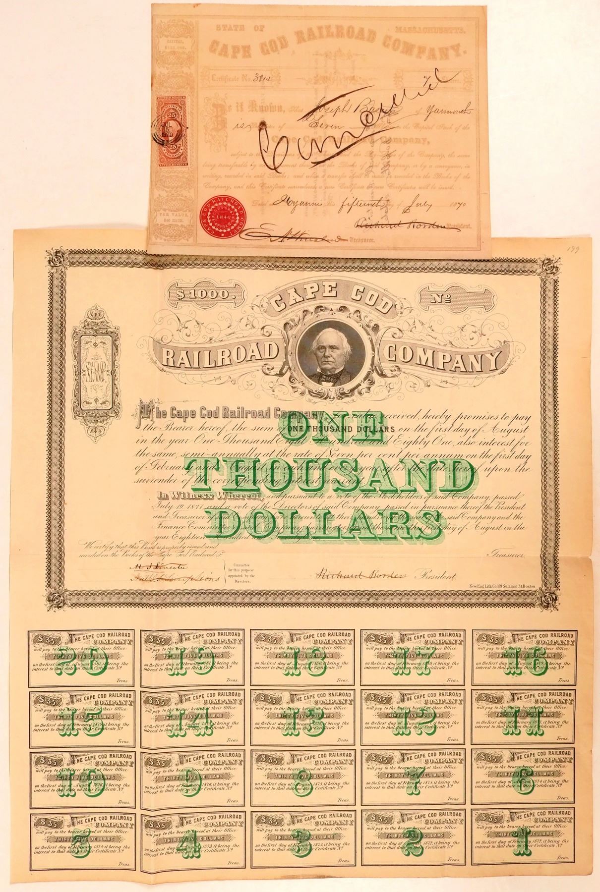 One stock and one bond. Stock is issued in 1870. Stamp frame at left with revenue. Purple ink on creme. Pen cxled. Inc. in Massachusetts in 1846. Bond is from 1871, $1,000. Black on creme with green underprint. Richard Bordern pictured in the center. Coupons at the bottom. Very attractive. uncancelled. New Engl. lith, Boston.