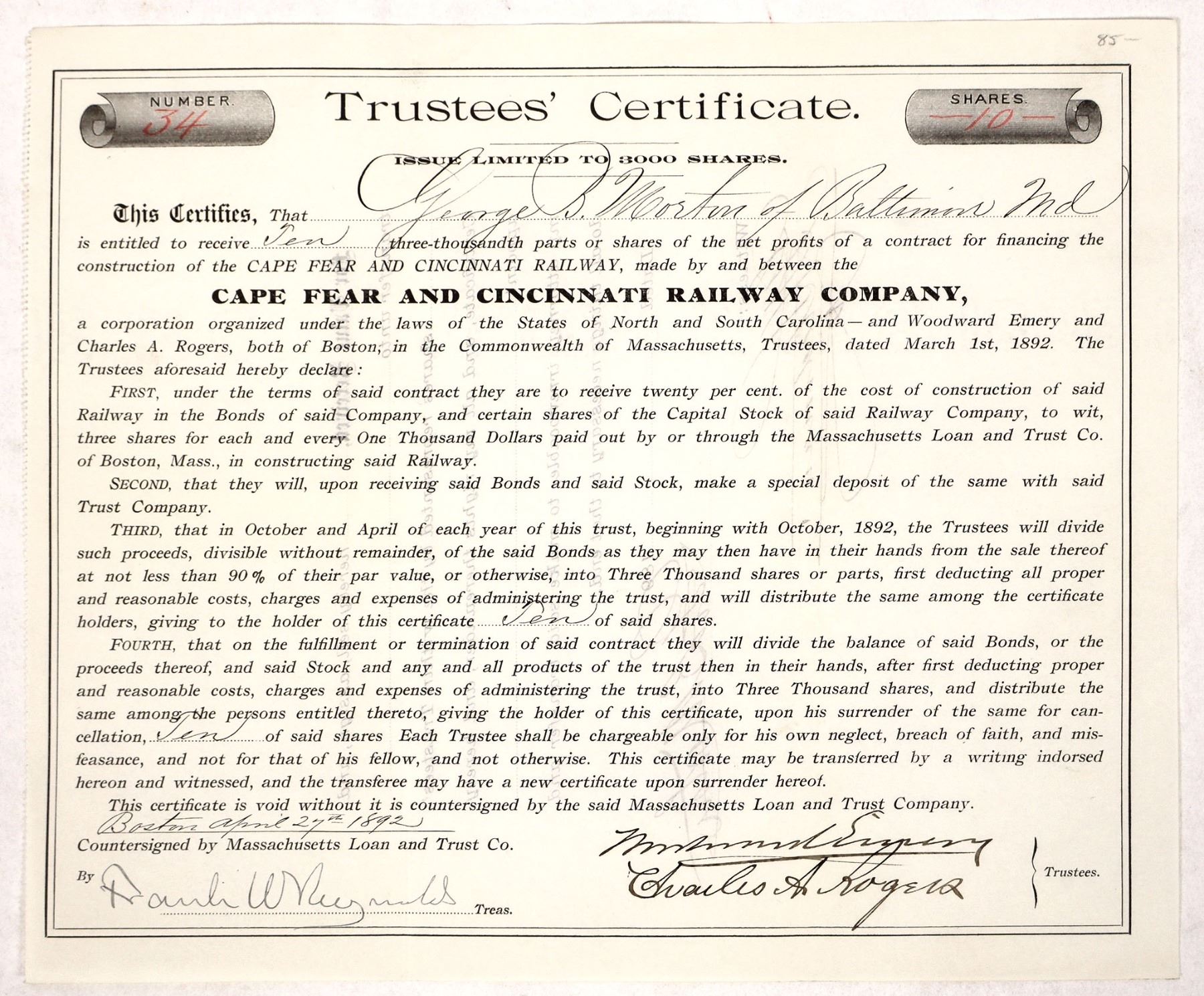 Rare 1892 Cape Fear and Cincinnati Railway Trustees' Certificate.
