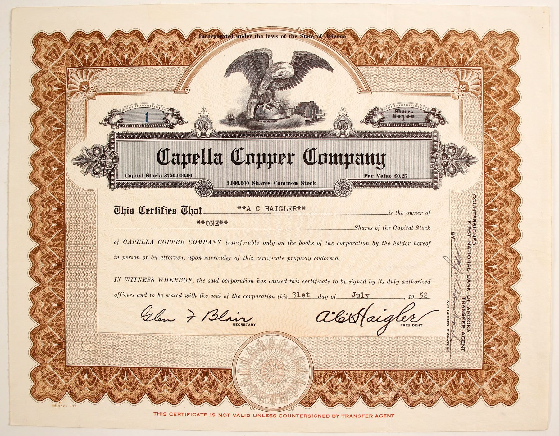 I/U 1952 to company President AC Haigler, 1 share. 3 vertical and 1 horizontal folds. State: Arizona City: Date: 1952
