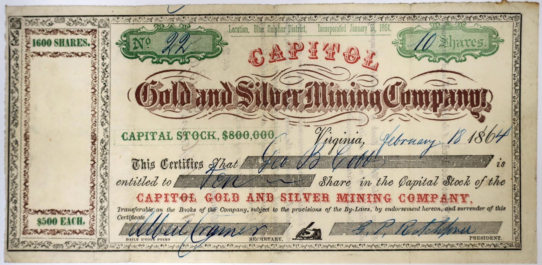 Fabulous use of colors: Deep purple, red, green and black on white. # 22 for 10 shares to George Cobb on 1864. Signed by Albert Garner and SP Ritchford president. The Capital was listed in Collins. Location of the mine was Blue Sulphur Springs. A. Cramer was secretary with an office at 7 'C' Street. Not cancelled. Daily Union Print (Virginia Daily Union newspaper; competitor of the Territorial Enterprise; 1862-1867). Minor edge and corner issues. Overall very nice. The company seems to have gotten off the ground, but did not make much of a splash. The Blue Sulphur [Spring] Mining District area was to the southwest of Silver City. Became part of the Silver City Mining District.
