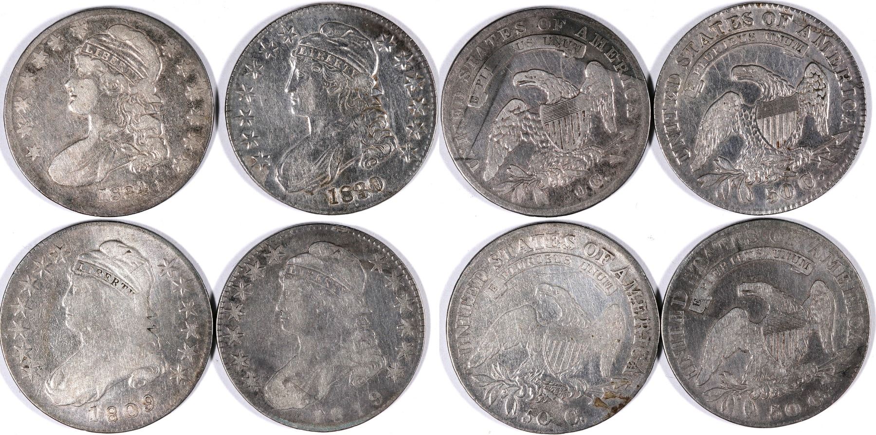 Lot of four Capped Bust half dollars: 1809 (G); 1819 (G); 1830 (F); 1834 (F).