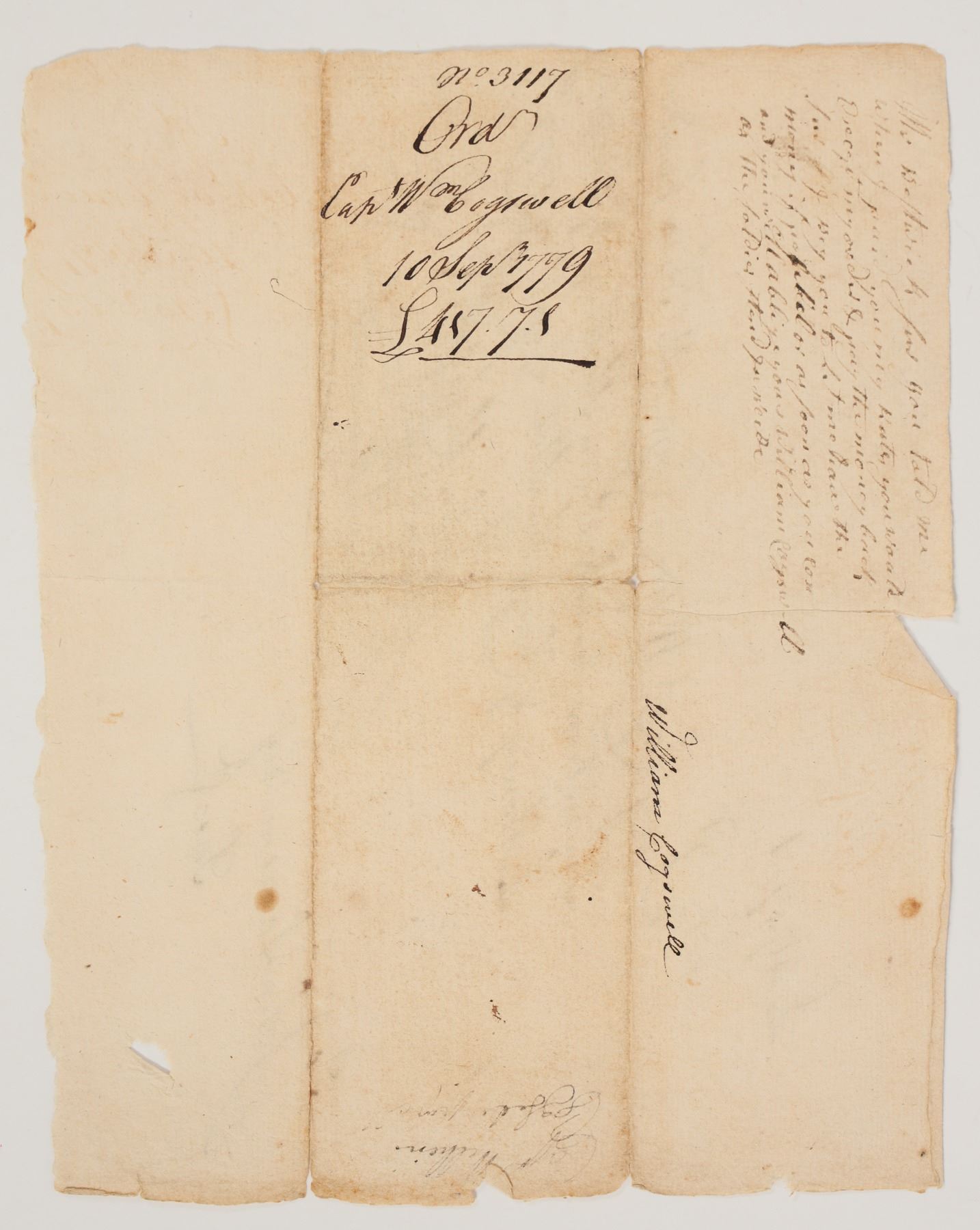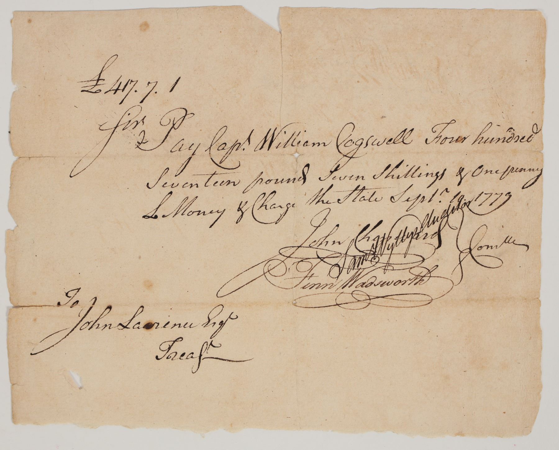 Receipt for payment to Capt. William Cogswell for 417 pounds, seven shillings, and one penny. Sept. 19, 1779. Signed by Cogswell on the reverse. Signed by John Sheppard(?) and Finn Wadsworth. 6.5 x 8" Wadsworth was Major under General James Wadsworth. There are numerous John Sheppards who were in the Revolutionary War. William Cogswell built the Cogswell Tavern in New Preston, CT. He was a First Selectman, a member of the Committee of Correspondence, and a Justice of the Peace. In 1779, William was Captain of a company in Lieut.-Col. Samuel Canfield's Regiment of Militia. Captain Cogswell's Co. was one of those that answered the New Haven Alarm in response to the attack by the British there on July 5, 1779. In May of 1781, Cogswell was promoted to Major in Col. Increase Moseley, Jr.'s 13th Regiment of Militia. Cogswell was in command under Gen. George Washington in the retreat from Long Island. General Washington and many of the principal officers of the Revolution were at different times entertained at Maj. Cogswell's tavern, and soldiers by the scores and hundreds. When the treason of Arnold was communicated to Washington, and he was at a point where he must pass through New Preston, early the next morning he dispatched a page, who was dressed in yellow flannel, to Maj. Cogswell's to have breakfast ready promptly at six o'clock. He reached there at that time and gave his suite fifteen minutes for breakfast. Washington's agitation was such that he himself did not sit down, but took a bowl of milk and walked the room while eating.
