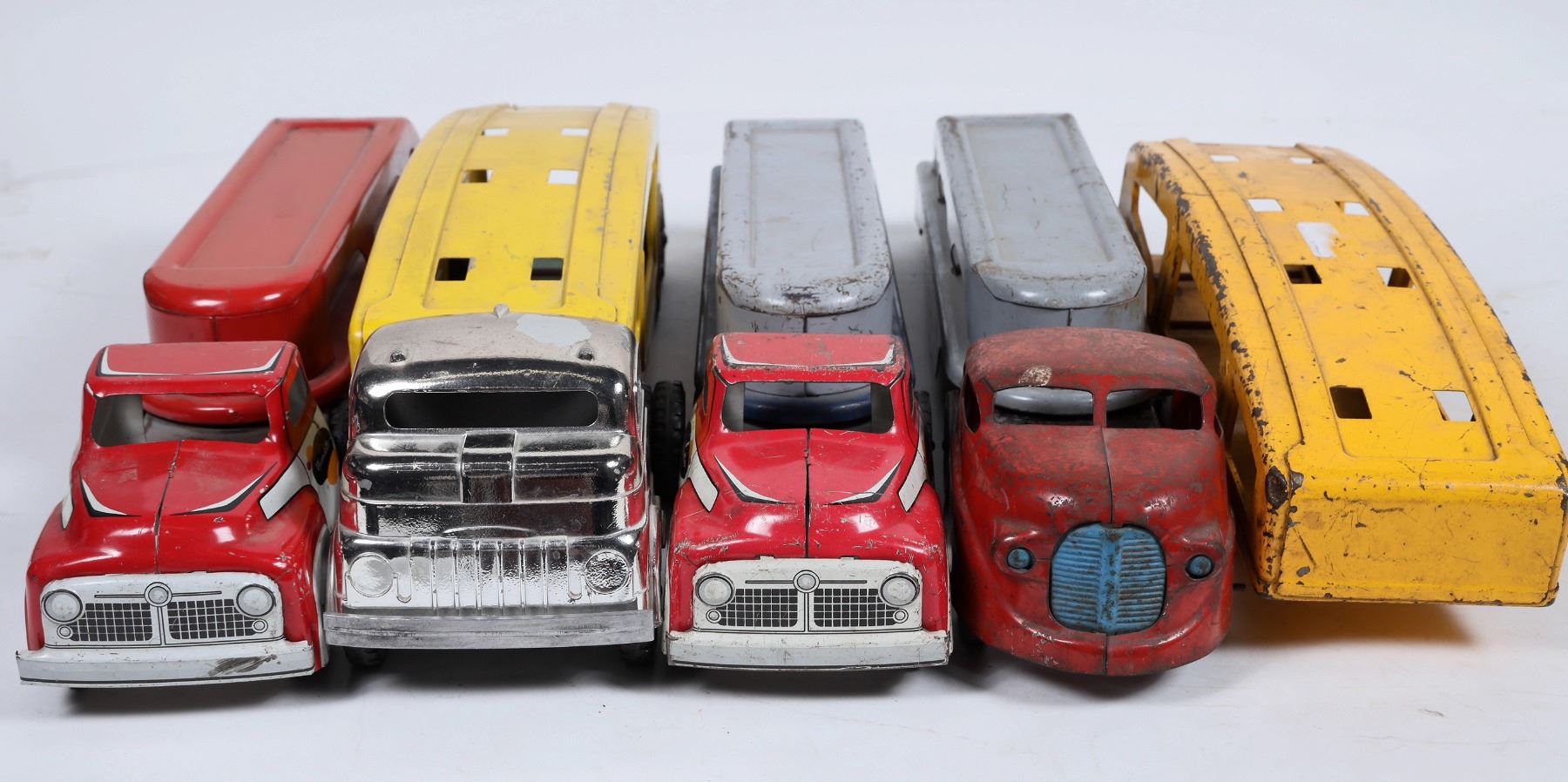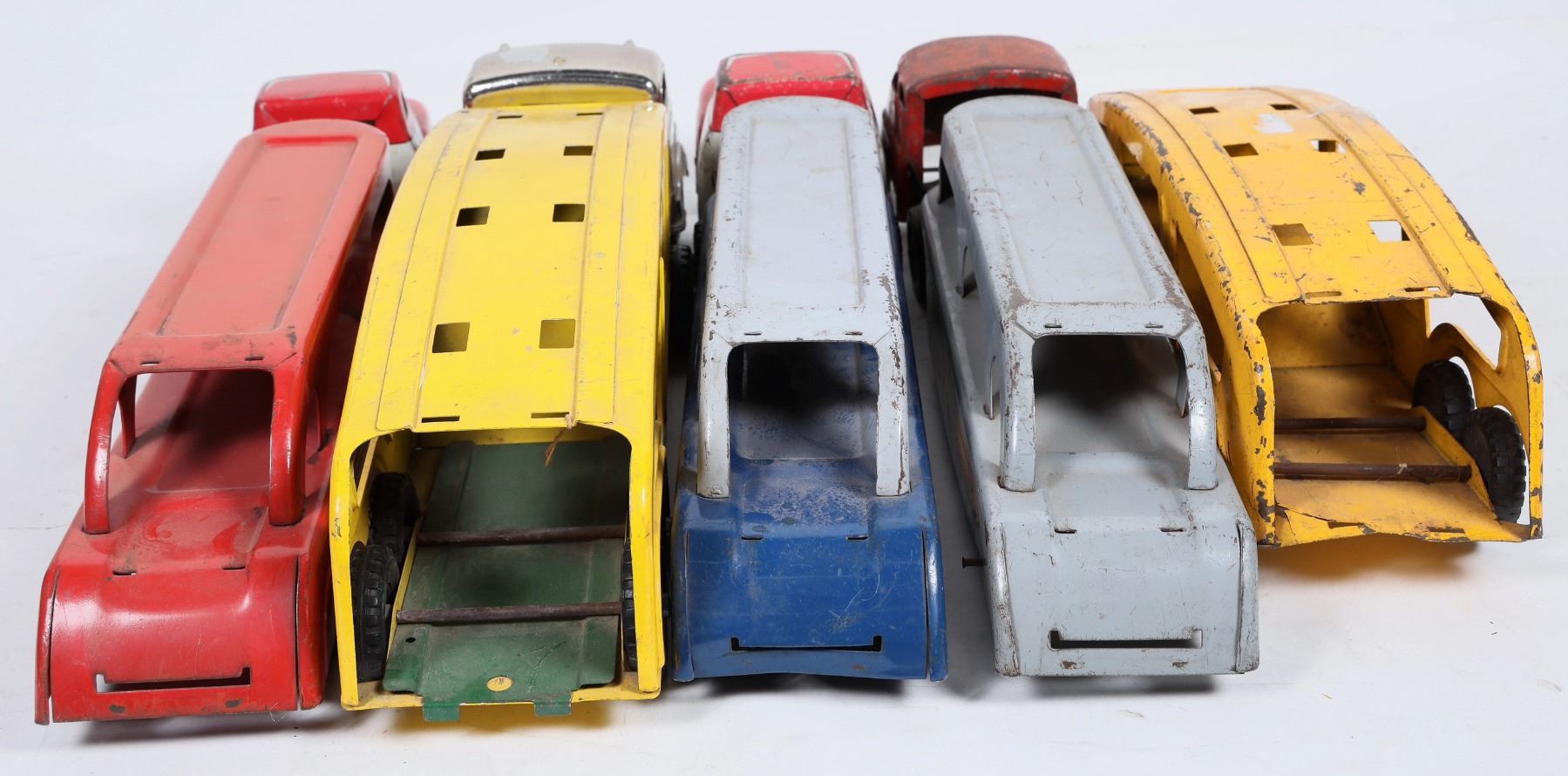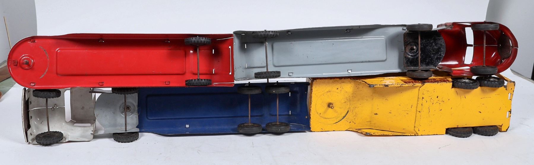 Four nice car carrier trucks plus a bonus Structo car carrier trailer. Three are Wyandotte.