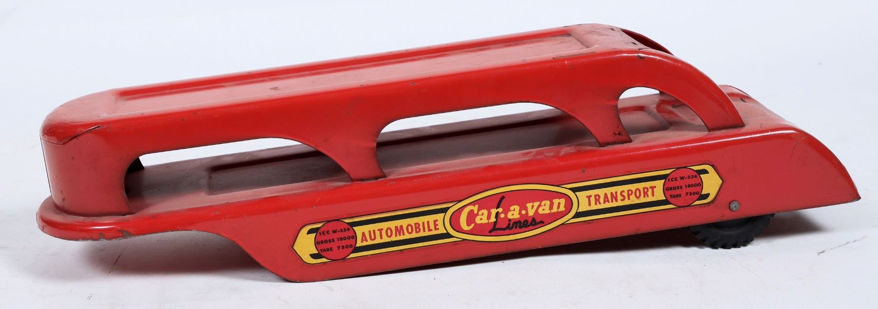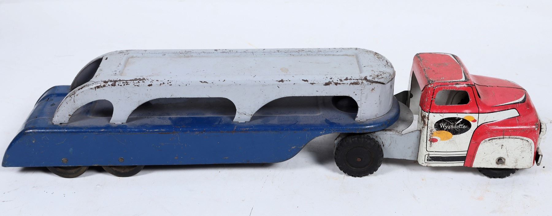 1. 1950s, pressed steel, readable decals with play wear, red and white truck, blue and gray car trailer, 24" long. Wyandotte.