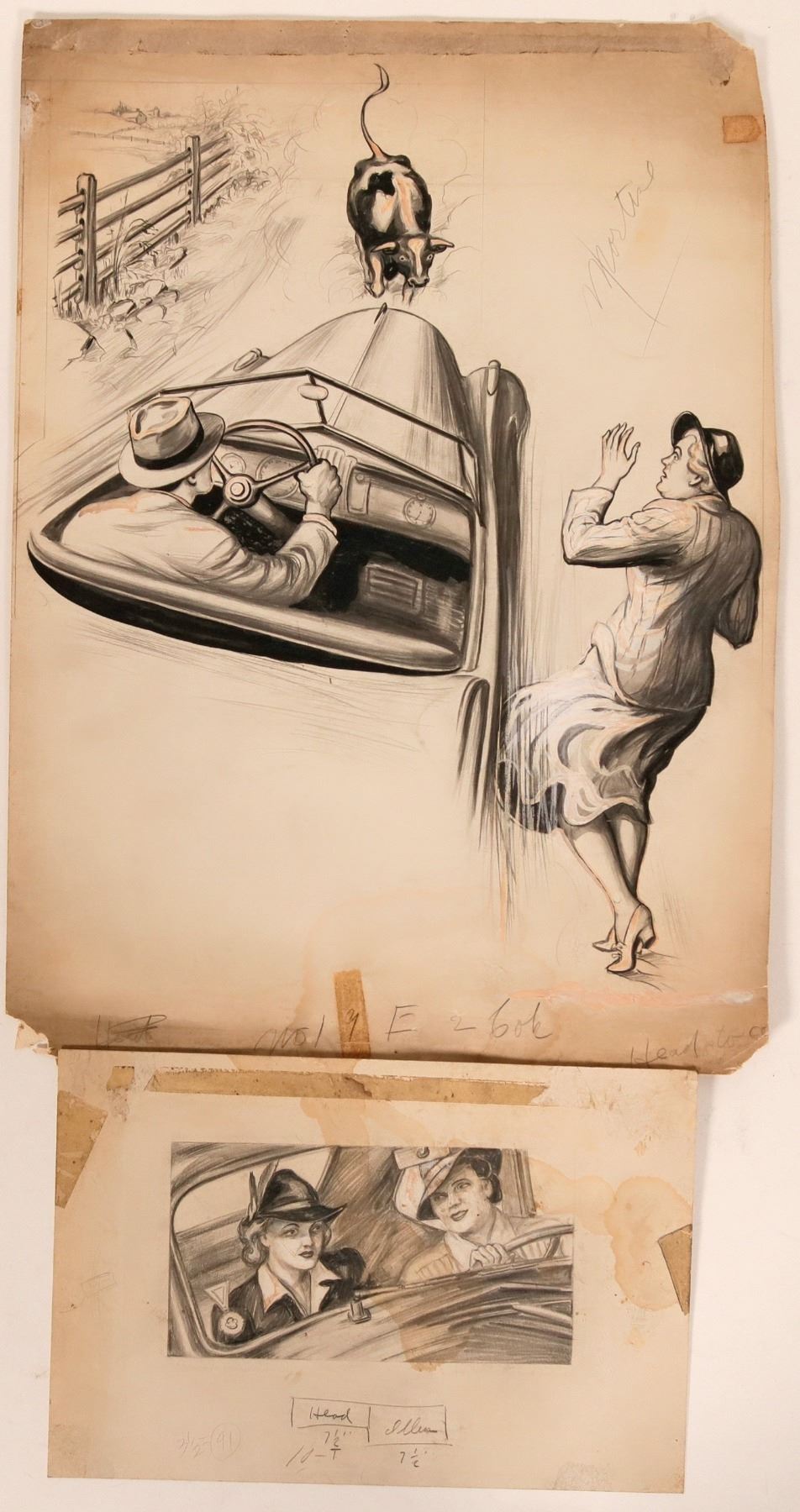 1) Pencil drawing of two women driving, 4" x 7.5". 2) Pencil and ink illustration of man driving fast, frightened woman on side of road and bull in front off car! 18" x 14".