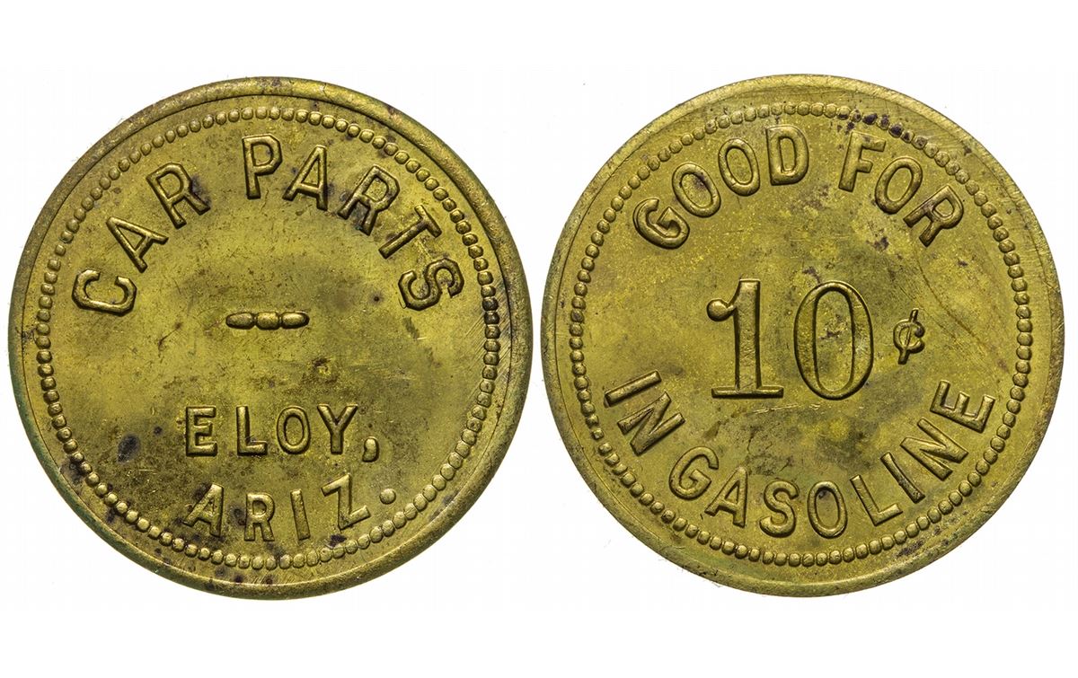 Obv.: Car Parts / Eloy, / Ariz.; Rev. : Good For / 10c / In Gasoline; Br.,26mm, R8.